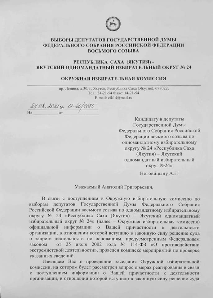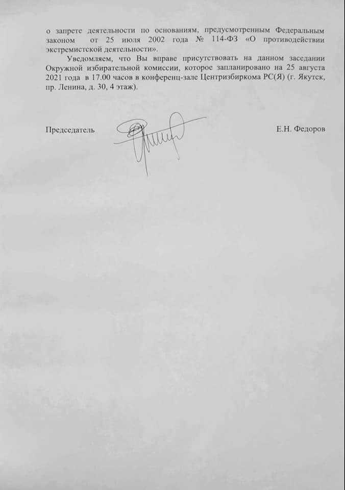Сегодня получил уведомление о том, что завтра будет заседание на котором рассмотрят вопрос о снятии меня с выборов. На каком основании и за какие действия меня причислили к экстремистам непонятно. Единственное что я получил - это уведомление о заседании. Избирательная комиссия завтра, т.е. 25 августа, попытается лишить жителей Якутии единственного независимого кандидата.