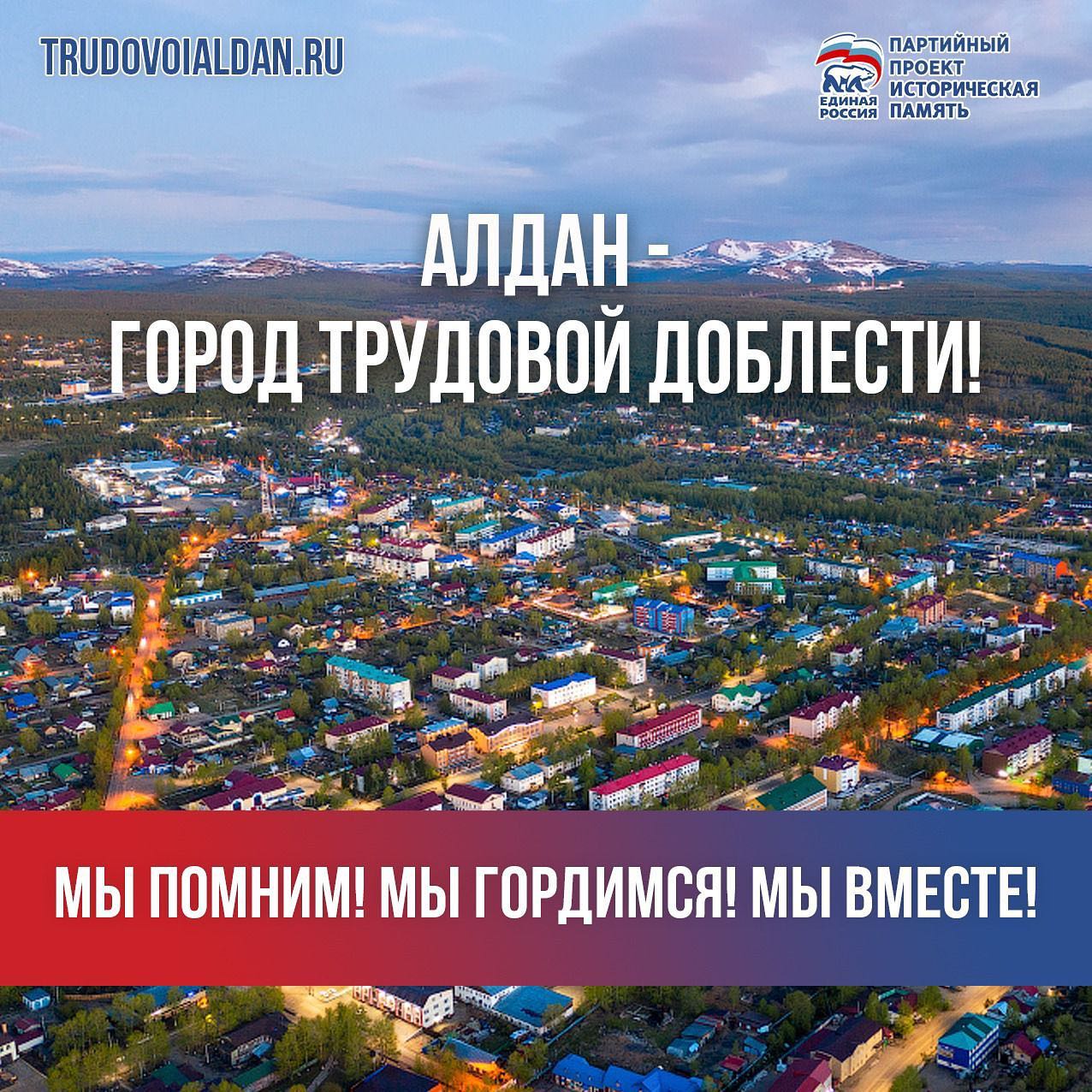 Трудовой подвиг Алдана в годы Великой Отечественной войны достоин этого высокого звания. Горняки Алдана за годы войны добыли и сдали государству 16 тонн золота и другие необходимые стране полезные ископаемые. В годы Великой Отечественной войны алданцами был внесен огромный вклад в общее дело. На фронт защищать Родину ушли 11740 алданцев, а семь из них удостоены звания Героя Советского Союза.
