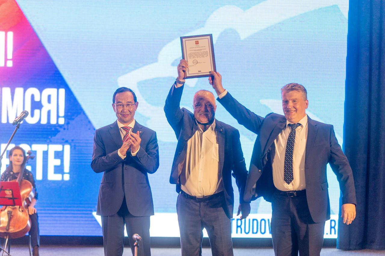 Указ Президента РФ Владимира Путина о присвоении Алдану почетного звания «Город трудовой доблести» глава Якутии под бурные аплодисменты передал главе района Северину Позднякову и главе города Алдан Александру Бугаю.