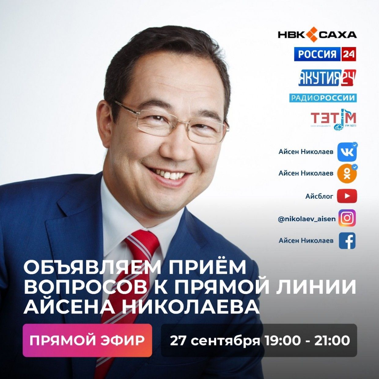 В понедельник, 27 сентября, в 19:00 часов состоится «Прямая линия с Айсеном Николаевым».