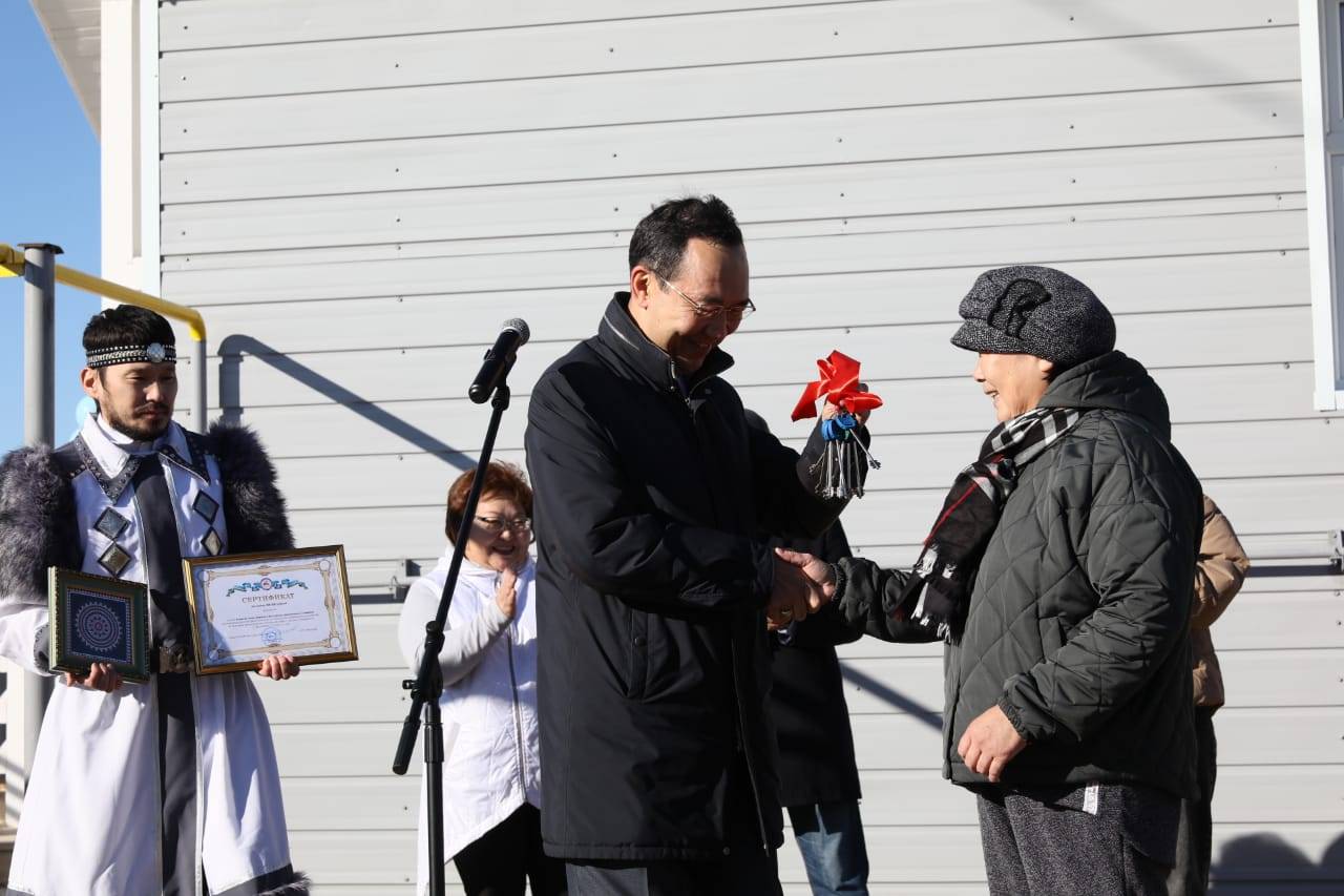 Первым был построен дом семьи Екатерины и Алексея Саввиных. Их дом начали возводить 20 августа. Ключи им вручил глава республики Айсен Николаев.