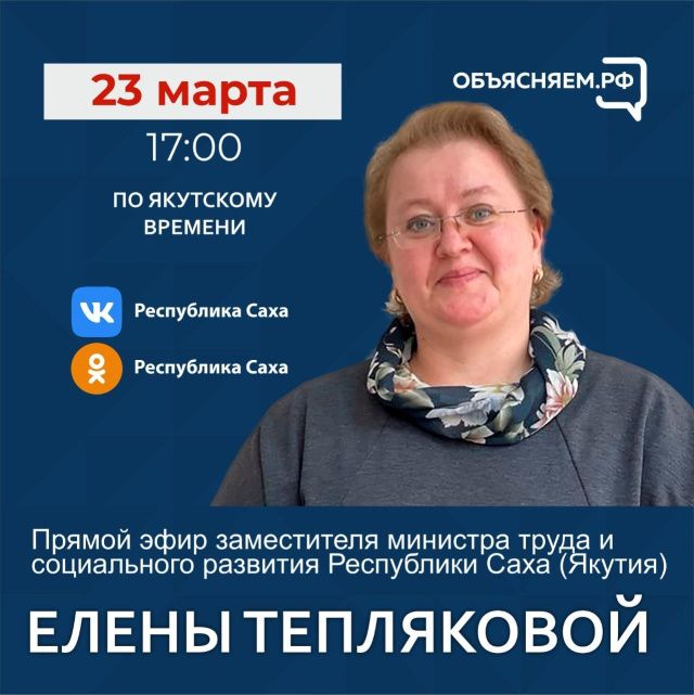 Заместитель министра труда и социального развития Республики Саха (Якутия) Теплякова Елена Юрьевна проведет 23 марта 2022 г. прямой эфир на официальных страницах Администрации Главы и Правительства республики SakhaGov в социальных сетях «ВКонтакте» и «Одноклассники».
