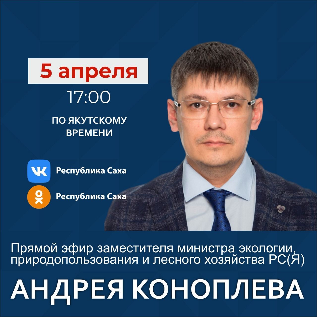 Заместитель министра экологии, природопользования и лесного хозяйства Республики Саха (Якутия) Коноплев Андрей Николаевич 5 апреля 2022 г. проведет прямой эфир на официальных страницах Администрации Главы и Правительства республики SakhaGov в социальных сетях «ВКонтакте» и «Одноклассники».
