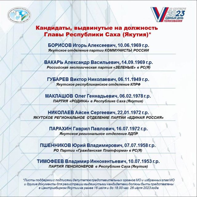 На выборах Главы Якутии всего 8 политических партий выдвинули 8 кандидатов, сообщает Центризбирком Якутии.
