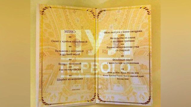 На выбор главам делегаций представлены салат с крабом и клубникой, борщ с телятиной или уха по-карельски и пельмени с осетриной и щучьей икрой. В меню также филе палтуса с мини-овощами, медальоны из оленя с лесными грибами или карамелизированная утка со спаржей. Из десертов - яблочный пирог с ванильным мороженым и шербет из морошки. Вино подается крымское и с Кубани.