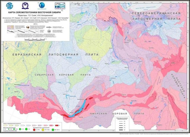 С помощью схематических изображений на карте выделены районы, наиболее подверженные катастрофическим землетрясениям. Ученым удалось выявить, последние несколько тысяч лет землетрясения происходит примерно в одних и тех же местах – в местах разломов земной коры. Как раз на этой территории располагаются горно-складчатые системы Байкало-Станового и Арктико-Азиатского сейсмических поясов.