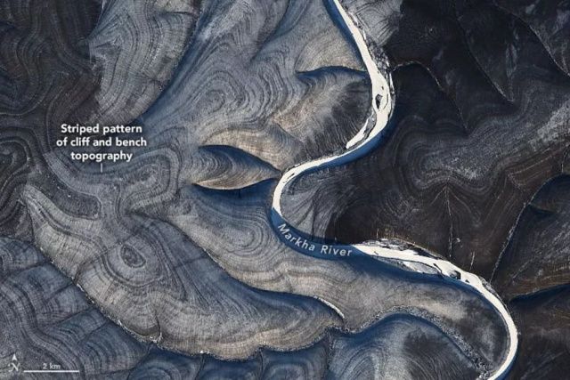 Речь идёт о серии спутниковых изображений ландшафта в районе реки Марха в Якутии. На фотографиях, сделанных со спутника Landsat 8, видна земля по обе стороны реки, покрытая чередующимися темными и светлыми полосами. Эффект «узорчатой земли» наблюдается на протяжении всех четырех сезонов года, но наиболее ярко он проявляется зимой, когда белый снег делает контрастный узор еще более резким.