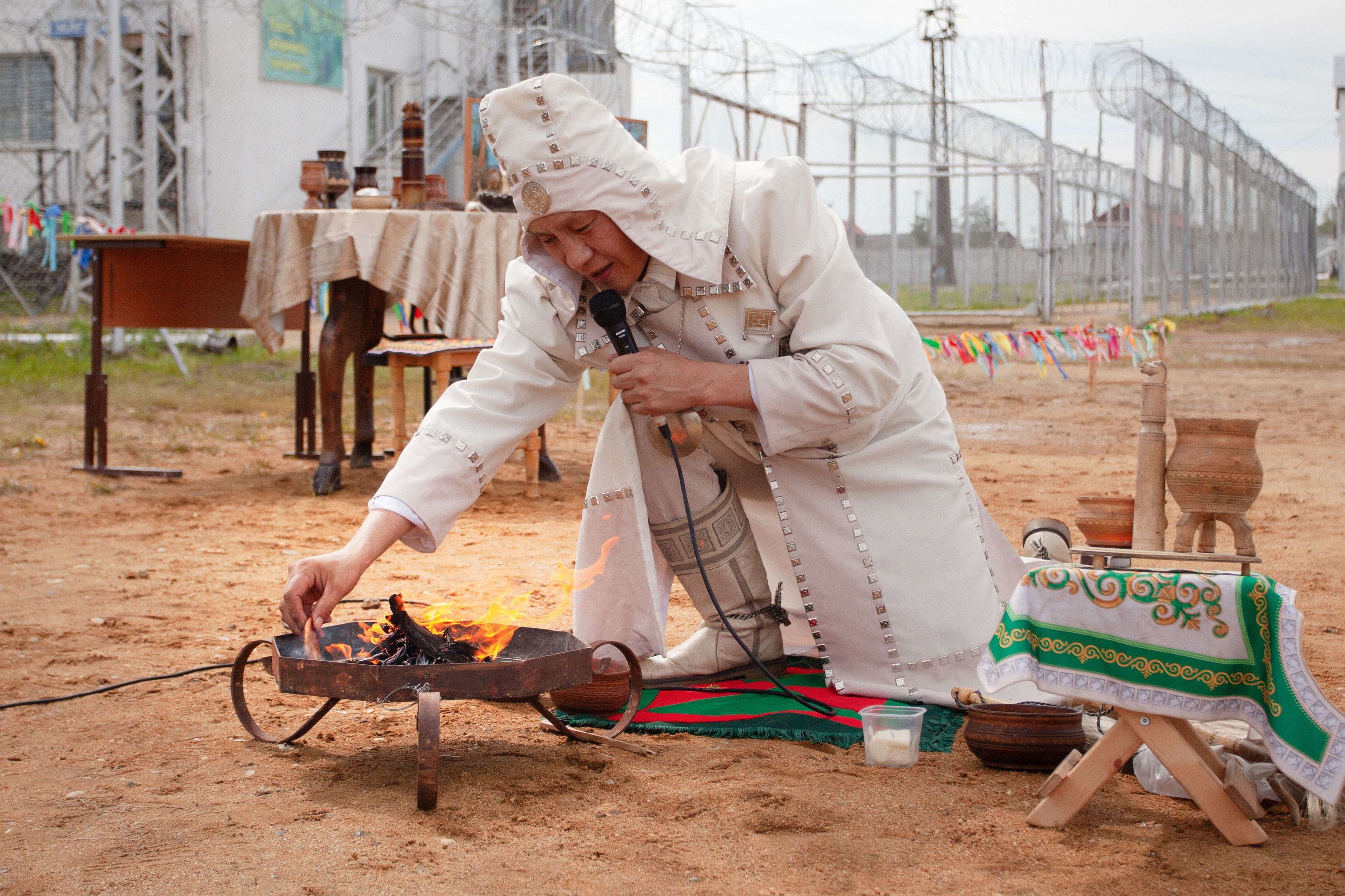 Приглашённые алгысчыты провели традиционные обряды очищения и благословения, древний ритуал окропления огня и земли кумысом.