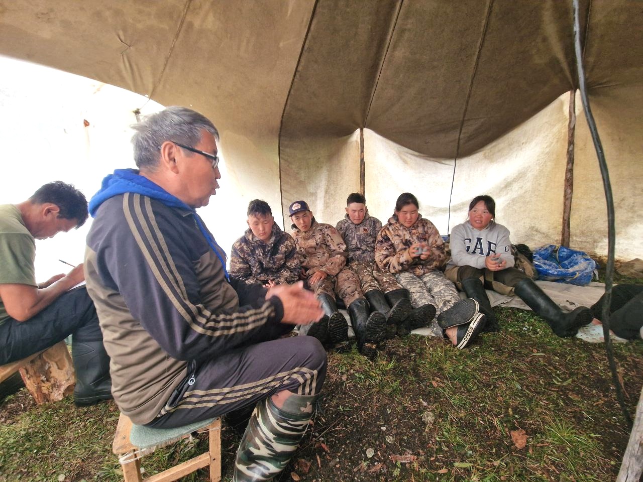 Затем экспедиция продолжила путь к месту стоянки эвенской кочевой родовой общины «Магир». Члены общины занимаются преимущественно оленеводством, а также проводят летний лагерь для детей из окрестных посёлков и других общин. Ребята работают наравне со взрослыми: ухаживают за оленями и помогают по хозяйству.