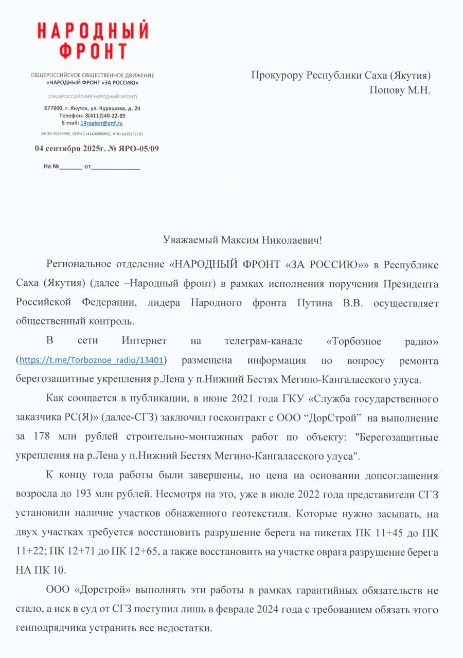 В свою очередь прокуратура Мегино-Кангаласского района фактически 21 сентября отписалась, что еще в июне 2024 года по факту неэффективного использования бюджетных средств в размере 700 тыс. руб., выделенных на возведение берегозащитных укреплений на реке Лена у п. Нижний Бестях, была организована процессуальная проверка, окончательное решение по которой еще не принято.