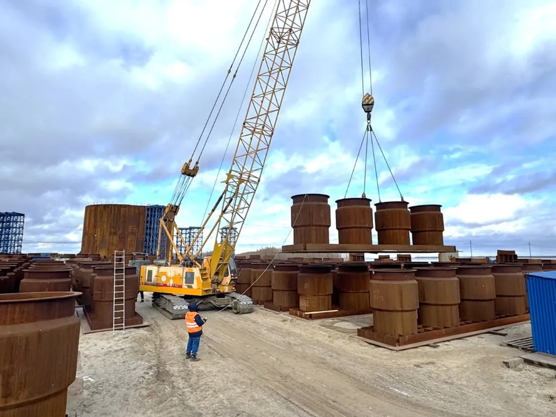 На левобережной технологической площадке продолжается укрупнительная сборка металлоконструкций дна второго коффердама для центрального пилона моста. Готовность этих работ составляет 20%. Предварительно завершено укрупнение всех 52 стеновых панелей коффердама. Первый, боковой, пилон собран полностью. Продолжается изготовление армокаркасов для свай — из 102 штук готово 83. Также ведётся строительство временного причала для приёма грузов, доставляемых по реке: выполняется устройство насыпи, погружение шпунта и труб причальной стенки.