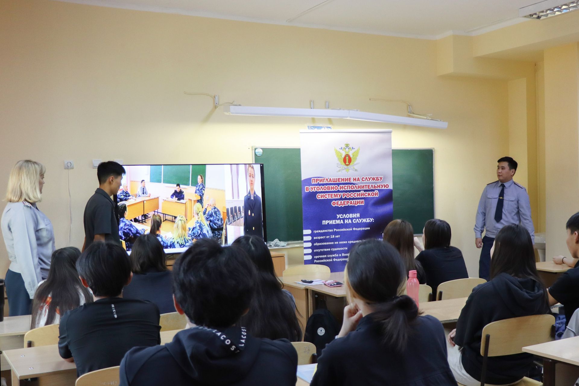 Заместитель начальника отдела кадров УФСИН Светлана Шабалина и выпускник Пермского института ФСИН России Амарсана Дашанимаев, который в настоящее время служит в отделе охраны УФСИН, встретились с учащимися 11-го класса республиканского лицея-интерната.
