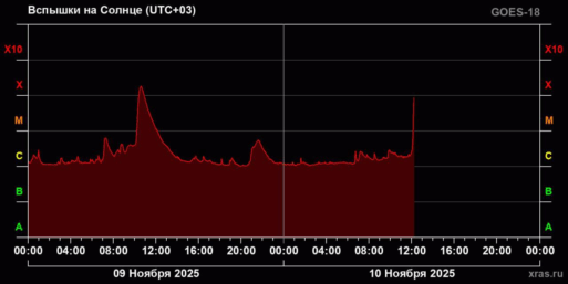 На Солнце произошла мощная вспышка высшего класса Х, интенсивность которой продолжает увеличиваться. Специалисты Лаборатории солнечной астрономии ИКИ РАН подтвердили, что показатель активности уже превысил пороговое значение для присвоения максимальной категории. Предупреждает тгк МК