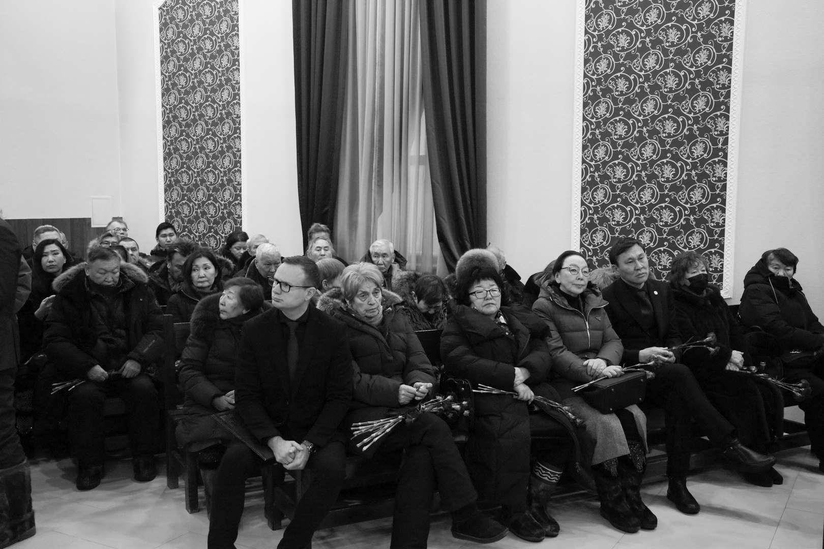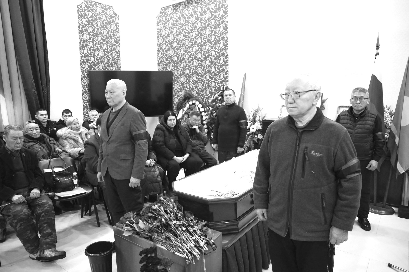 После отпевания люди расселись по скамейкам, мест не хватило. Больше десятка людей остались стоять на ногах, к ним то и дело присоединялись вновь пришедшие. Церемонию прощания вел Александр Подголов, заместитель председателя Ил Тумэн, народный депутат и член партии «Единая Россия».