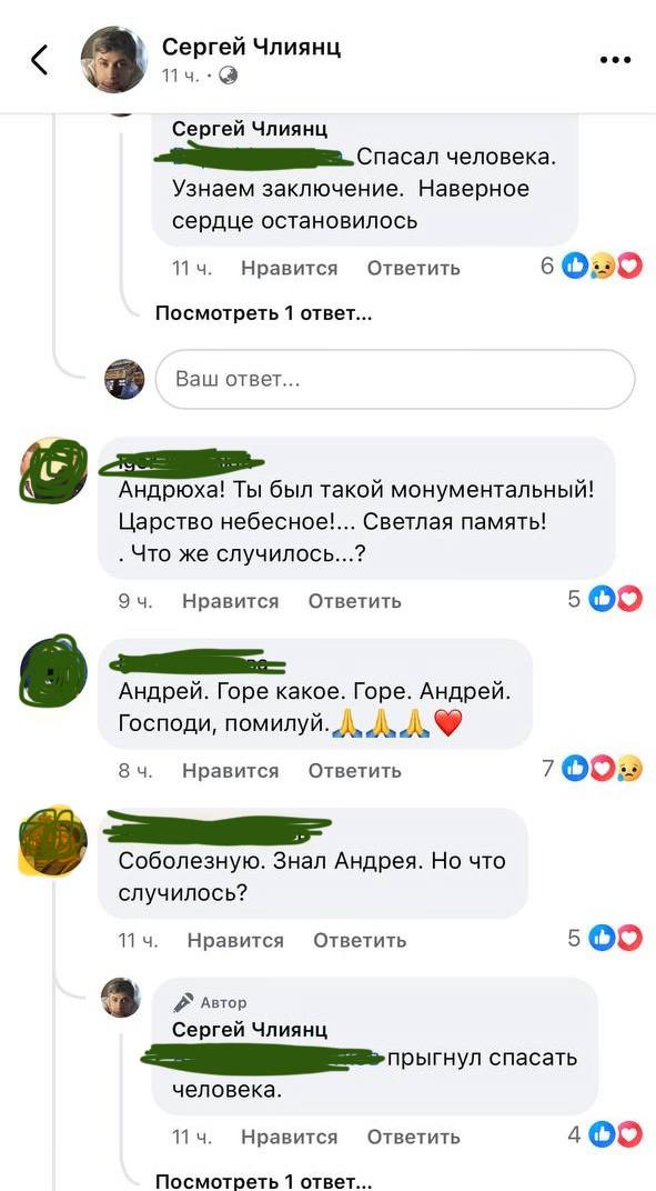 Режиссёр Сергей Члиянц («Бумер», «Бумер-2», «Живой», «Настройщик», «Кармен», «Мама, не горюй», «Небо в алмазах») пишет в запрещённой соцсети, что Андрей Хорошев «погиб, спасая другого человека», «прыгнув за ним».