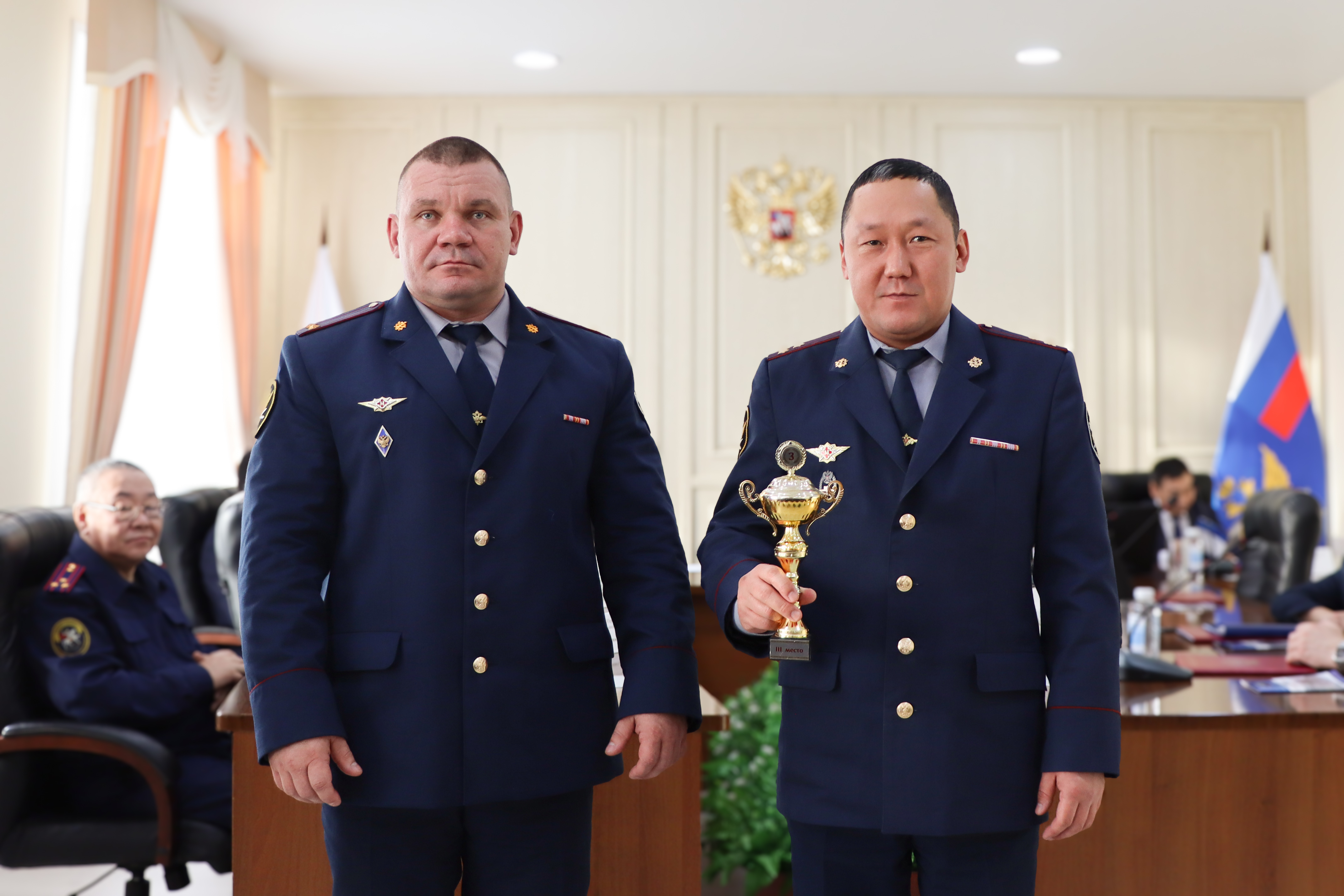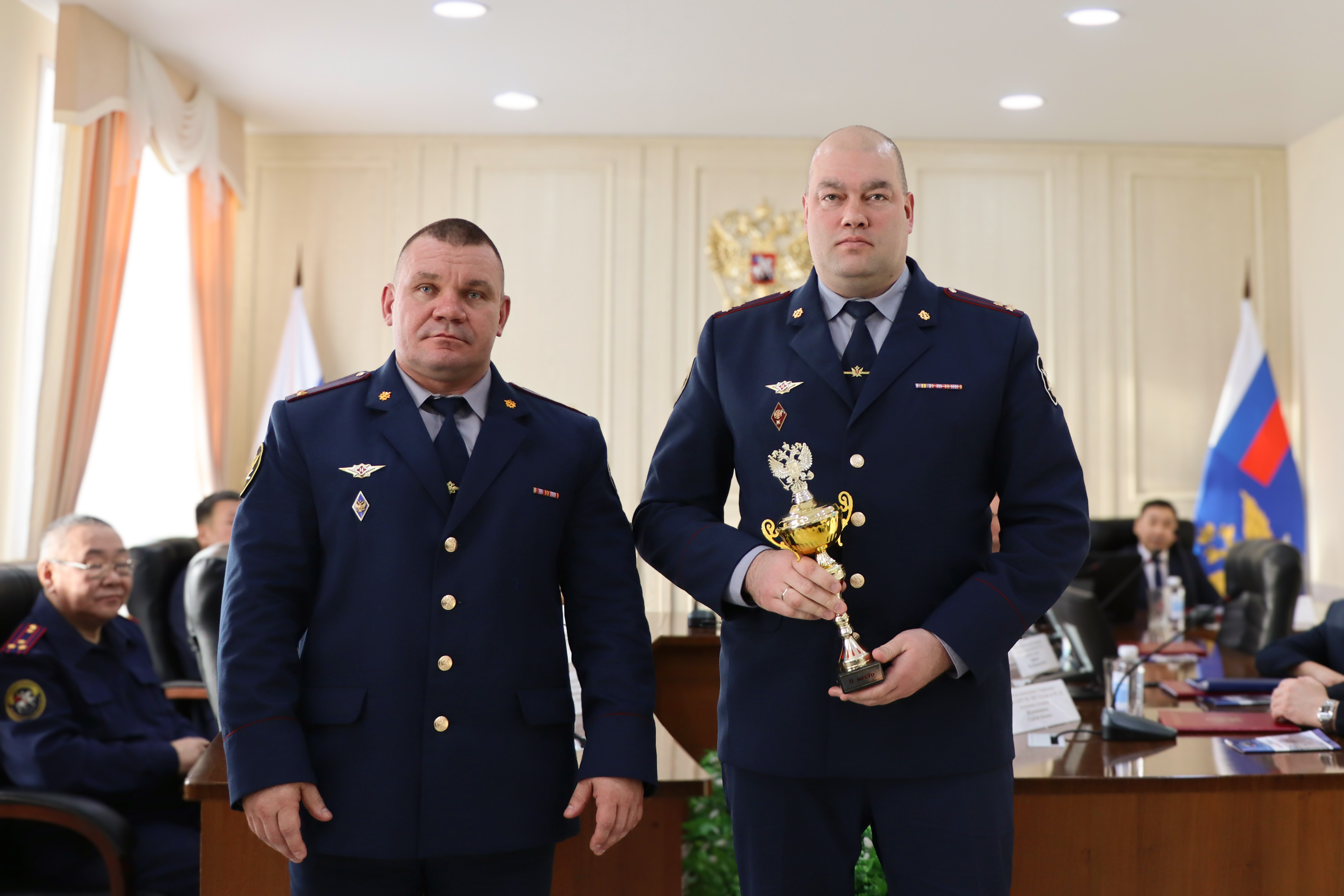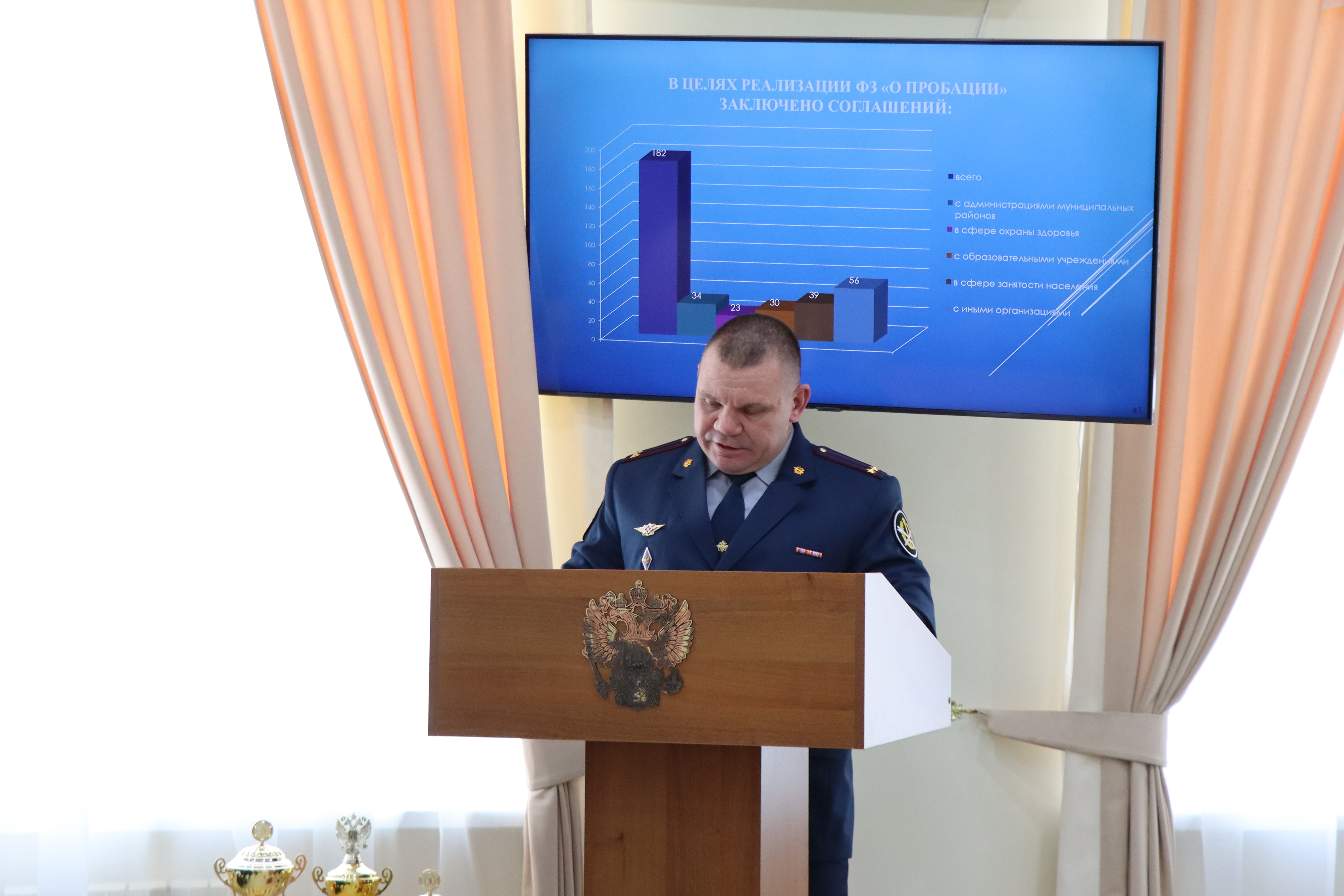 В завершение доклада Сергей Акимов поблагодарил присутствующих за взаимодействие и поддержку в решении возникающих вопросов, обозначил задачи на 2026 год и вручил кубки начальникам учреждений, занявших призовые места по итогам рейтинговой оценки: 1 место присуждено коллективу ИК-6, 2 место – ИК-7, 3 место – ИК-1.