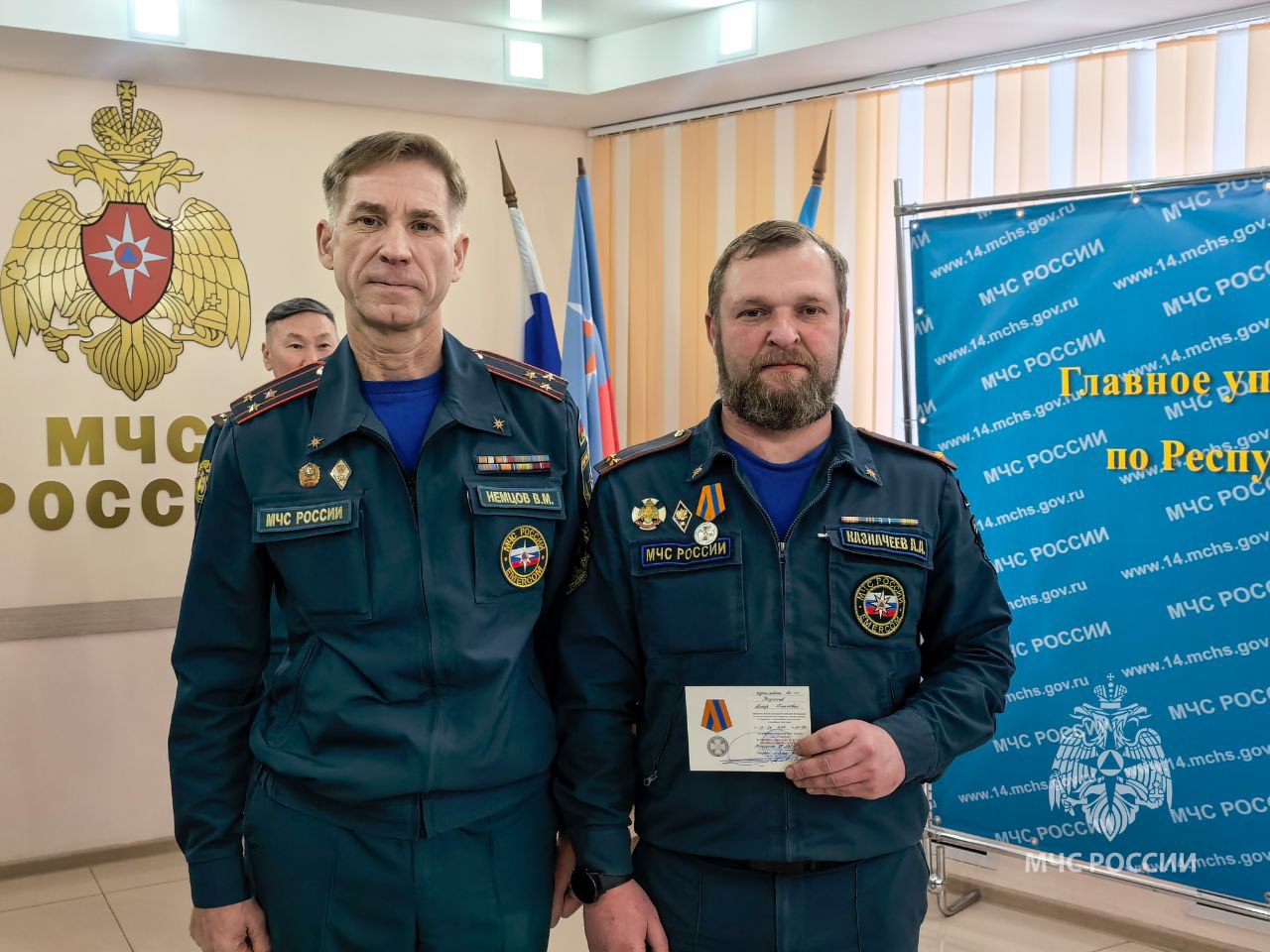 медалью МЧС России «За отличие в ликвидации последствий чрезвычайной ситуации» — за проявленную отвагу и решительность при устранении угроз, минимизацию ущерба и спасение жизней в экстремальных условиях - Спиридонов Николай и Казначеев Амир;