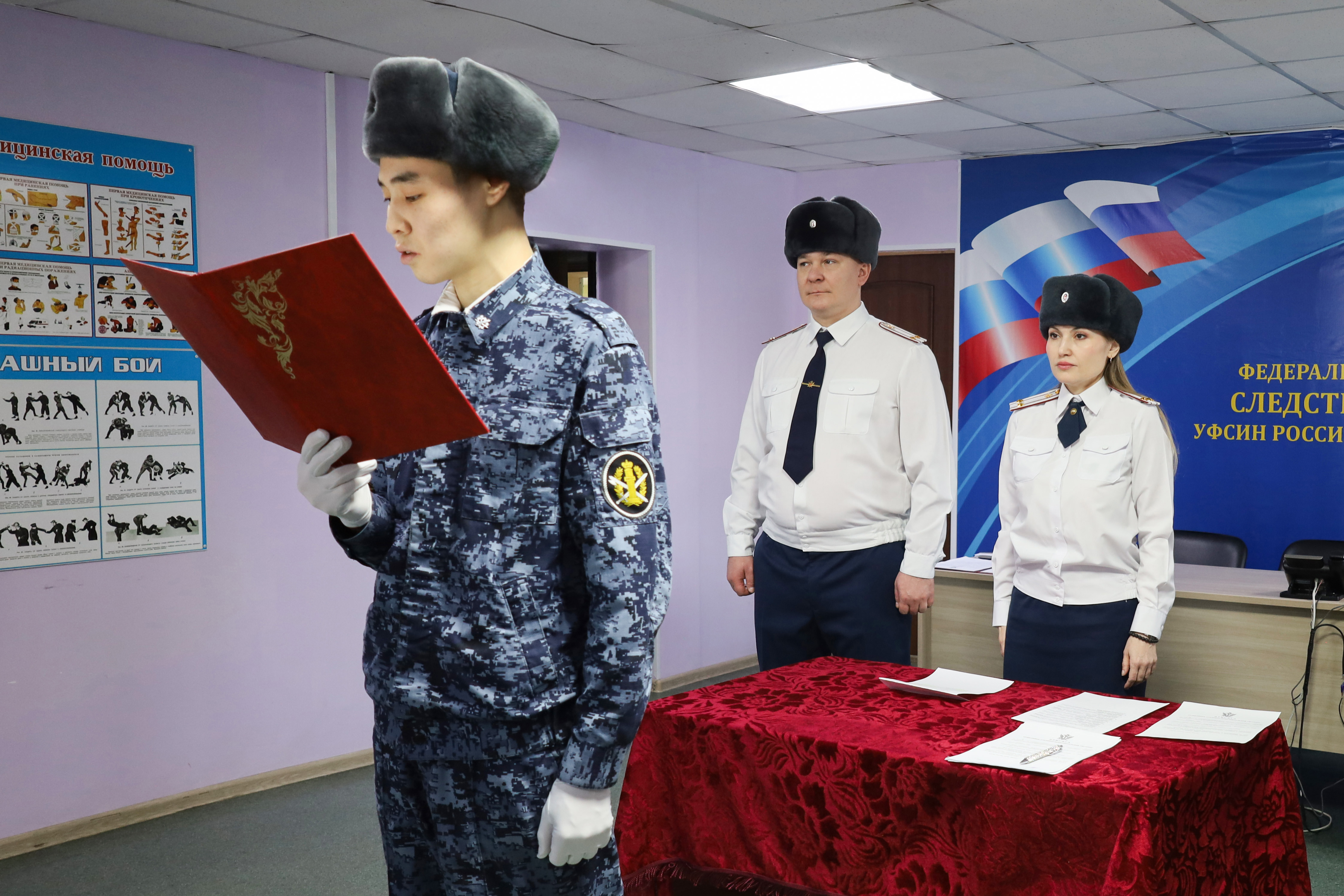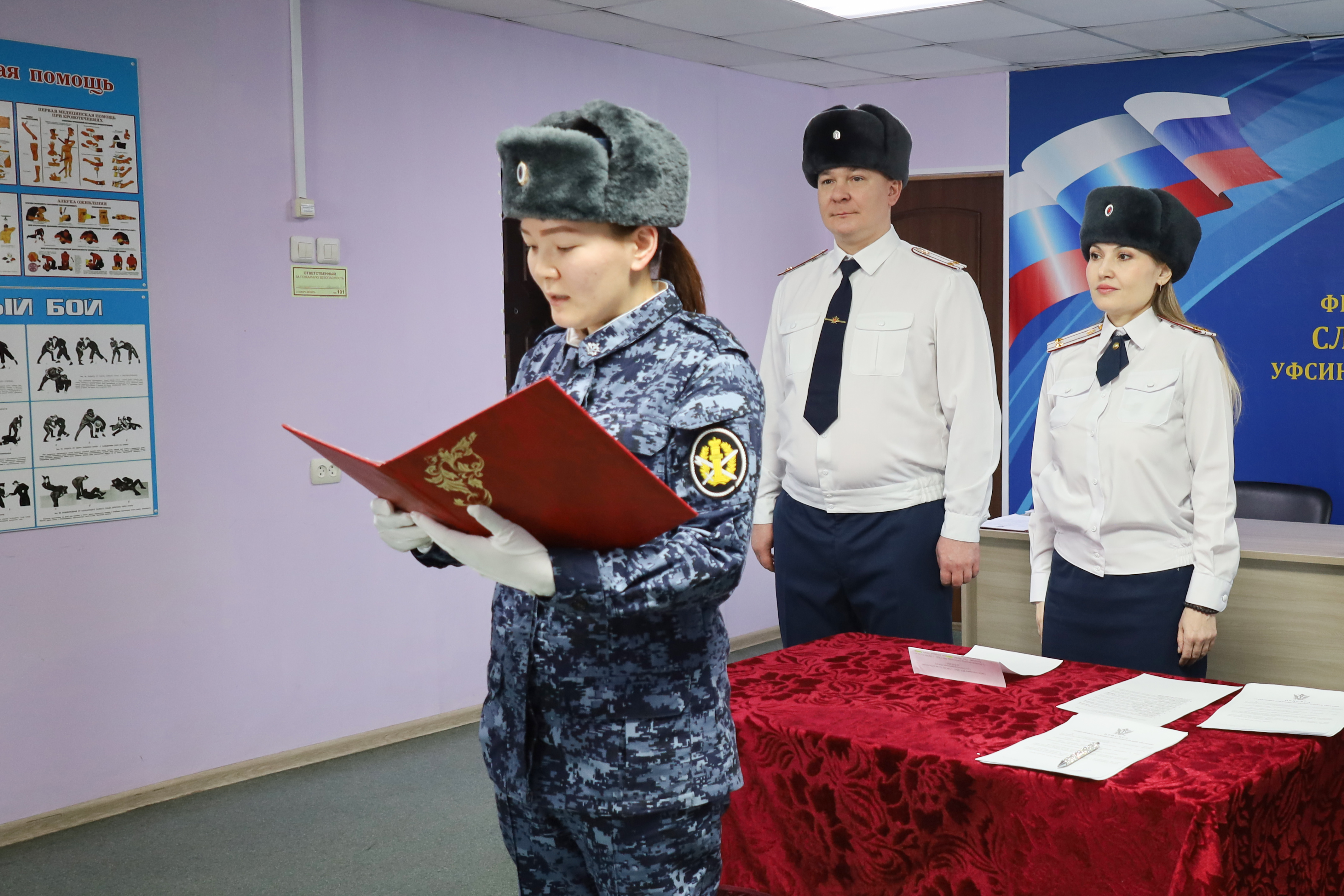В присутствии личного состава девушки и юноши, впервые поступившие на службу в уголовно-исполнительную систему, присягнули на верность Российской Федерации и поклялись быть мужественными, честными и бдительными, достойно исполнять свой служебный долг.