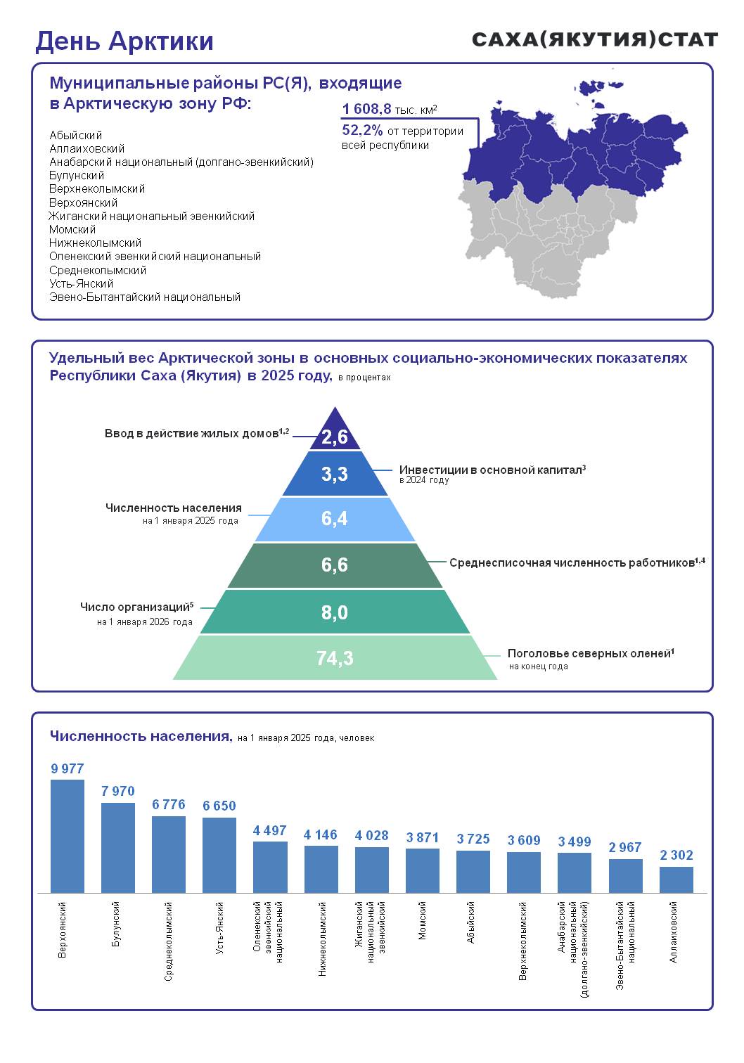 В Республике Саха (Якутия) к Арктической зоне относятся 13 районов: Абыйский, Аллаиховский, Анабарский национальный (долгано-эвенкийский), Булунский, Верхнеколымский, Верхоянский, Жиганский национальный эвенкийский, Момский, Нижнеколымский, Оленёкский эвенкийский национальный, Среднеколымский, Усть-Янский и Эвено-Бытантайский национальный. Общая площадь арктических районов Якутии равна 1608,8 тыс. км2, что составляет 52,2% от всей территории республики и 33,3% от всей Арктической зоны Российской Федерации.