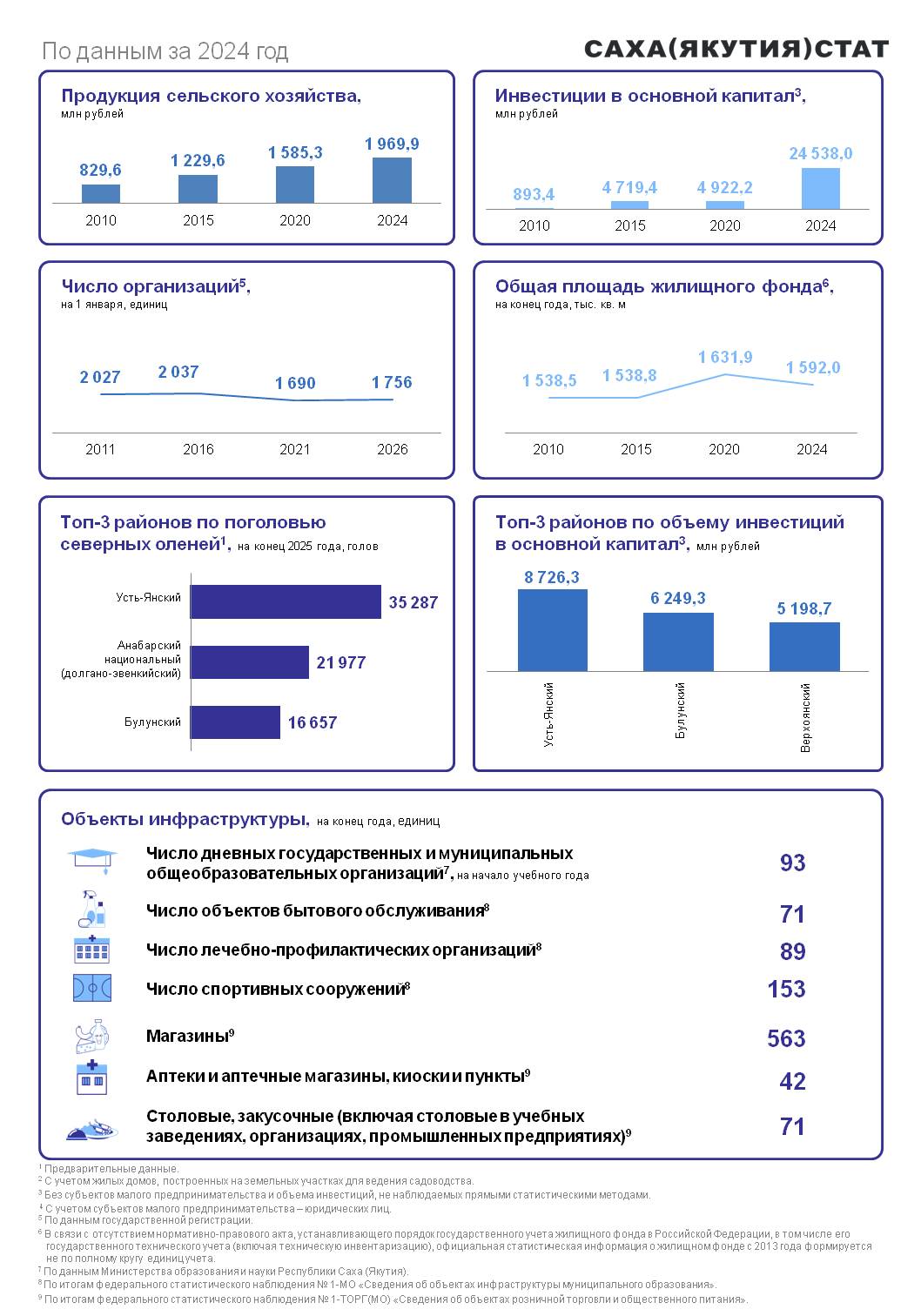 Основой экономики арктических районов является сельское хозяйство, в первую очередь, северное оленеводство. По предварительным данным на конец 2025 года поголовье оленей составляло 124028 голов или 74,3% оленьего поголовья всей республики. Кроме того, в Арктике разводят лошадей и крупный рогатый скот, но, в силу климата, в гораздо меньших количествах – 8,8% и 2,7% от поголовья животных в республике соответственно. Также важное место в арктической экономике занимает промышленное рыболовство.