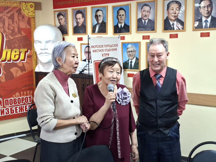 Произведения о любви, блестяще исполненные членом контрольно-ревизионной комиссии Якутского горкома КПРФ Анастасией Петровой, до глубины души затронули собравшихся. С сольными песнями также выступили руководители Якутского отделения женского движения «Надежда России» Саргылана Гоголева и Альбина Иванова, заслуженный экономист РСФСР Анна Кондратьева, старшая пионервожатая Якутской республиканской пионерской организации Людмила Оконешникова, активный участник художественной самодеятельности Светлана Сивцева.
