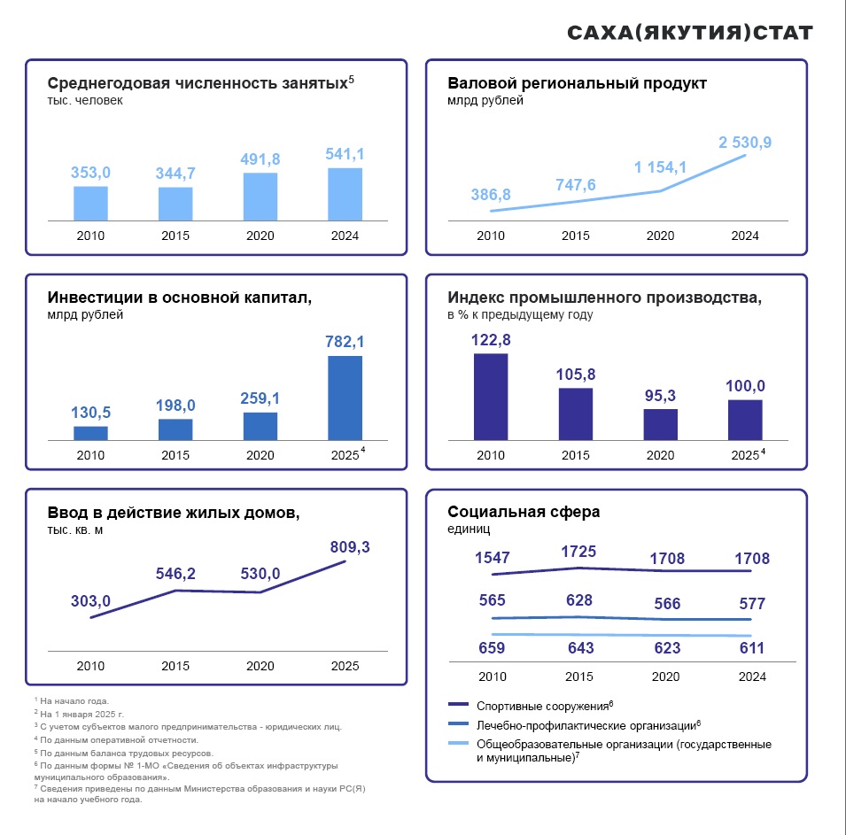 Якутия – один из лидеров Дальневосточного федерального округа. Валовой региональный продукт увеличился с 747,6 млрд рублей в 2015 году до 2530,9 млрд рублей в 2024 году, и по ВРП республика занимала первое место в ДВФО. Объем инвестиций в основной капитал с 2015 по 2025 год вырос в сопоставимых ценах в 2,1 раза и составлял 782,1 млрд рублей. По этому показателю Якутию опережала лишь Амурская область (1021,8 млрд рублей). В полтора раза с 2015 по 2025 год увеличился ввод в действие жилых домов (809,3 тыс.м2), больше жилья введено только в Приморском крае (1384,7 тыс.м2).