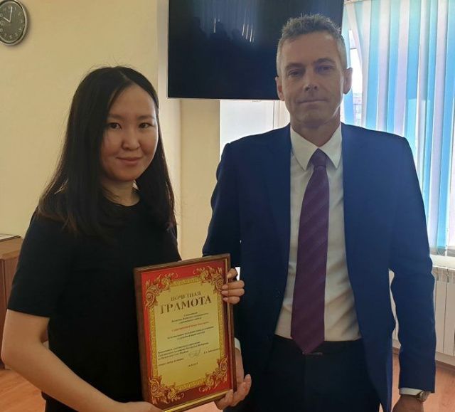 19 сентября 2019 года из рук руководителя следственного управления СК России по Республике Саха (Якутия) она получила Почетную грамоту.