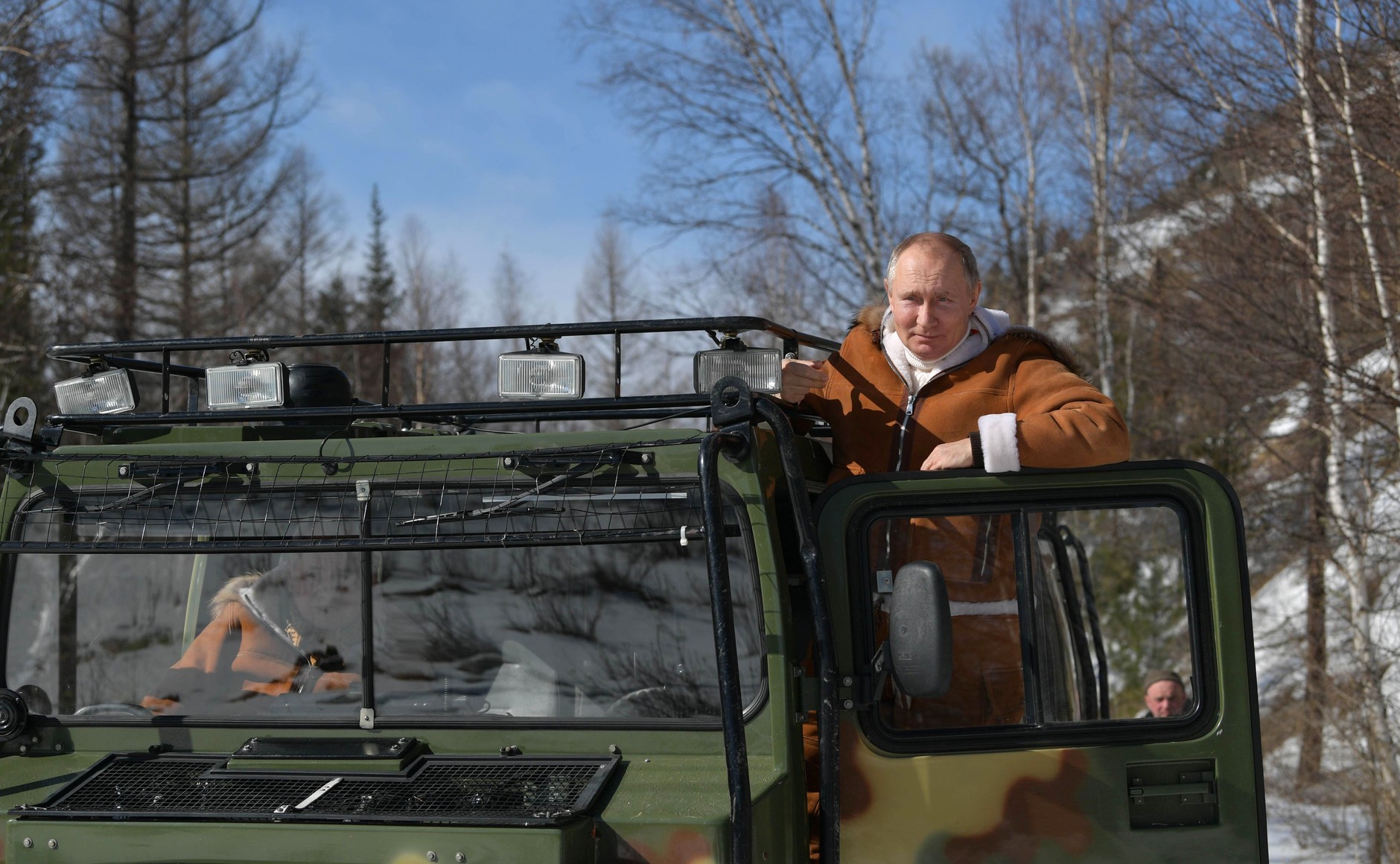 За руль гусеничного вездехода цвета хаки глава государства сел сам. В поездку на внедорожной технике Путин и Шойгу выехали в костюмах-дубленках и унтах, с которых Путин стряхивал снег перед посадкой за руль. Пробираясь через сугробы, валежник, ручьи и узкие проходы между деревьями, путники делали остановки — в частности, как видно на кадрах, у заброшенного деревянного строения. Шойгу рассказывал Путину об окрестностях, местность ему была знакома. «Хорошо здесь», — отметил президент.