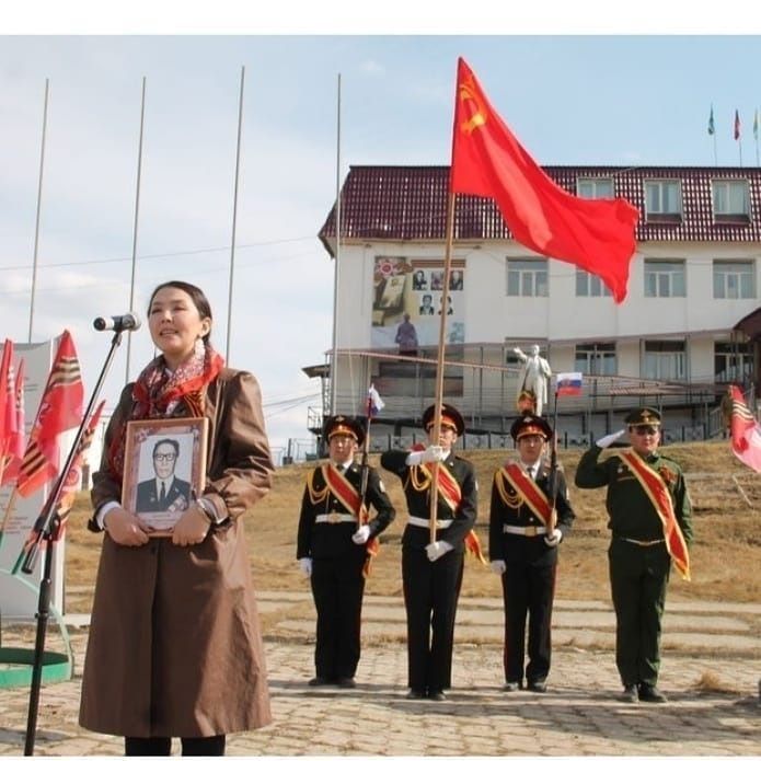 Под звуки победного марша на площадь перед зданием администрации улуса работники средней школы имени участника Великой Отечественной войны, кавалера ордена «Полярная звезда» И.М.Павлова внесли красное Знамя Победы.
