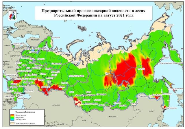 Долгосрочный прогноз рисков возникновения чрезвычайных ситуаций в лесах Российской Федерации, связанных с лесными пожарами, на август 2021 года подготовлен на основании фактических данных гидрометеорологической обстановки на июль, данных долгосрочного прогноза температуры и осадков от Гидрометцентра России, многолетних данных о горимости лесов и результатов многомерного корреляционного анализа.