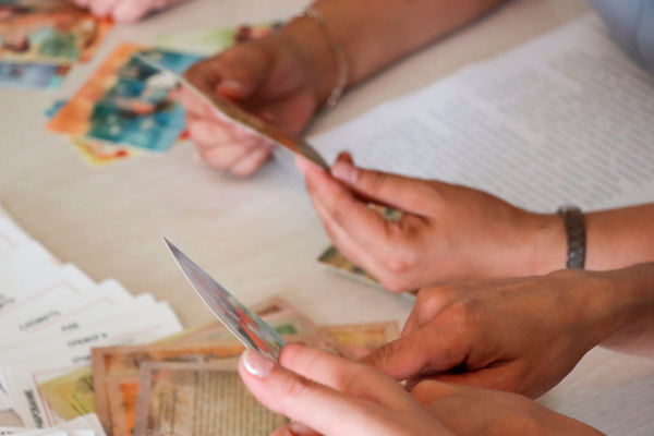 В ходе занятия применялись метафорические ассоциативные карты «Он», «Ресурсы», «Я и все-все-все» – проективные картинки, на которых представлены лица, предметы, сюжеты и содержатся различные истории, описания жизненных ситуаций. При этом был важен не заложенный изначально автором смысл, а душевный отклик участника тренинга на попавшееся ему изображение или текст.