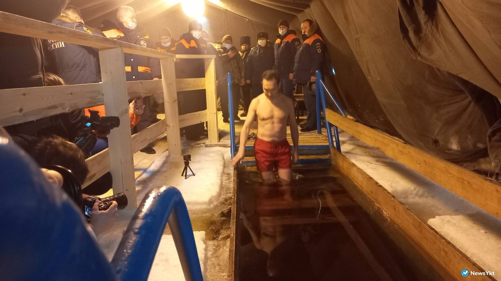 Первым в освященную воду традиционно окунулся глава республики Айсен Николаев.