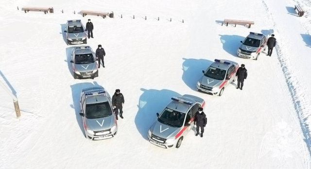 Сотрудники групп задержания Якутского ОВО Росгвардии на территории площади служебными автомобилями образовали символ «V».