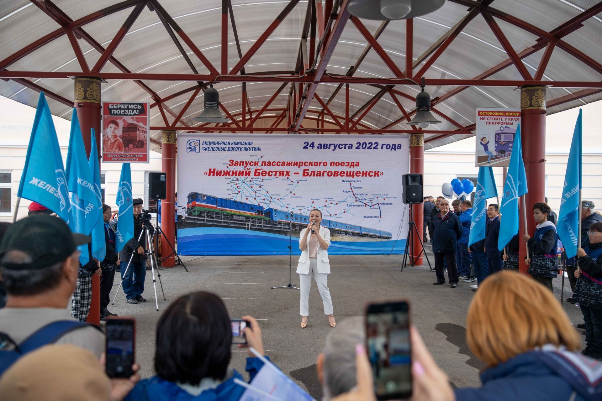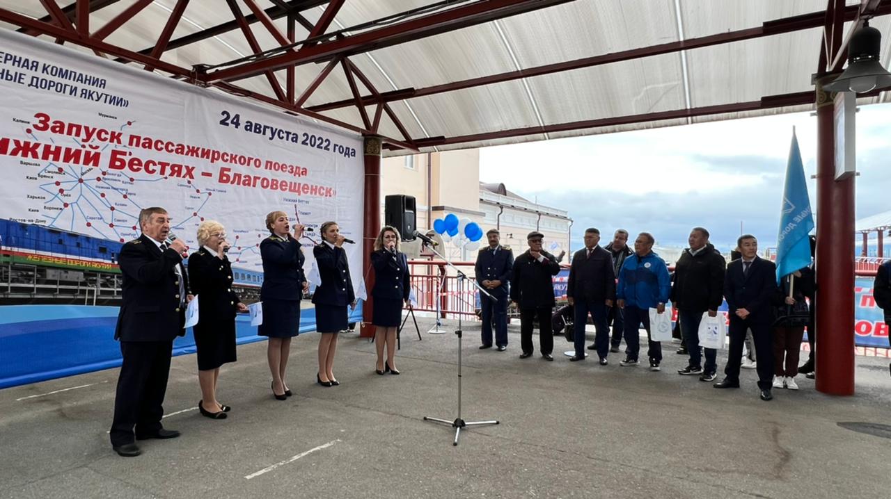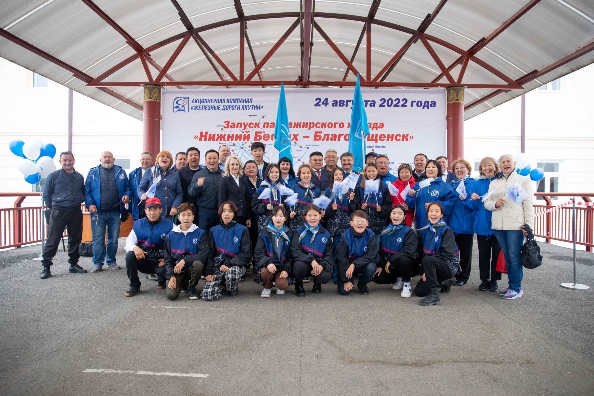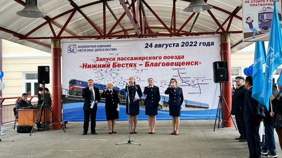 Точно по расписанию в 17.00 местного времени под звуки марша «Прощание славянки» пассажирский поезд Нижний Бестях – Благовещенск отправился в свой первый рейс. Пассажиры первого рейса поезда №317 получили от Акционерной компании «Железные дороги Якутии» памятные подарки.