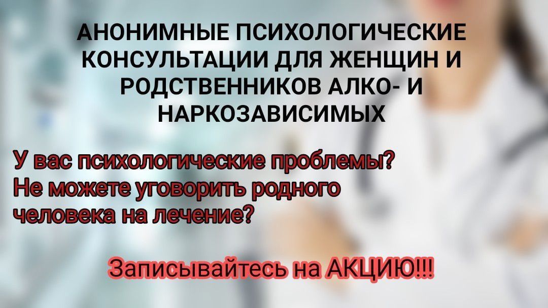 Только 19 октября Якутский наркологический диспансер объявляет однодневную акцию – АНОНИМНЫЕ ПСИХОЛОГИЧЕСКИЕ КОНСУЛЬТАЦИИ И ПРИЁМ ВРАЧЕЙ НАРКОЛОГОВ ДЛЯ ЖЕНЩИН И РОДСТВЕННИЦ (ПОДРУГ) ЛЮДЕЙ С АЛКОГОЛЬНОЙ (НАРКОТИЧЕСКОЙ) ЗАВИСИМОСТЬЮ.