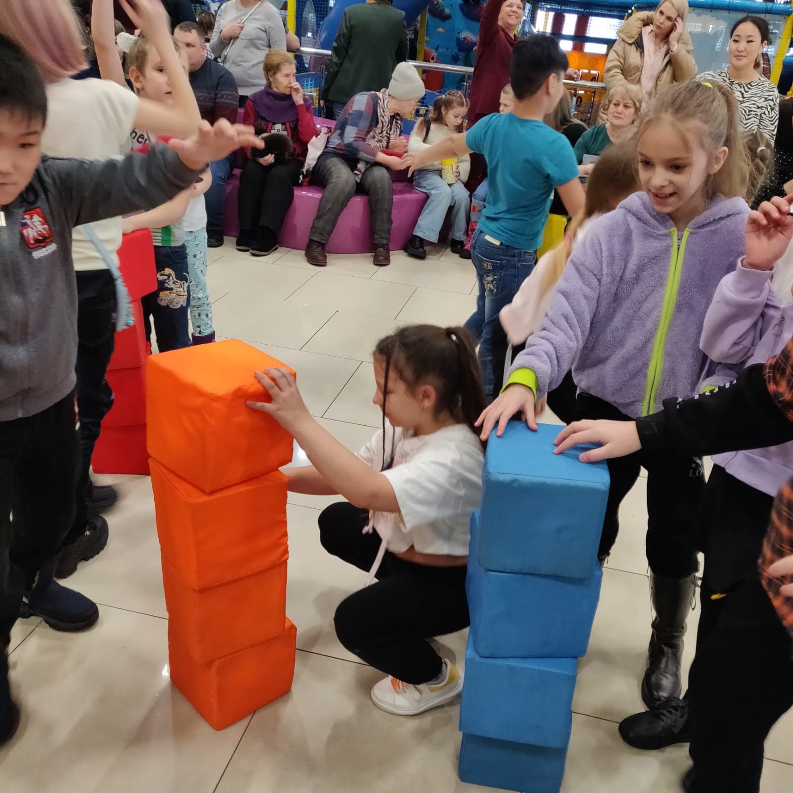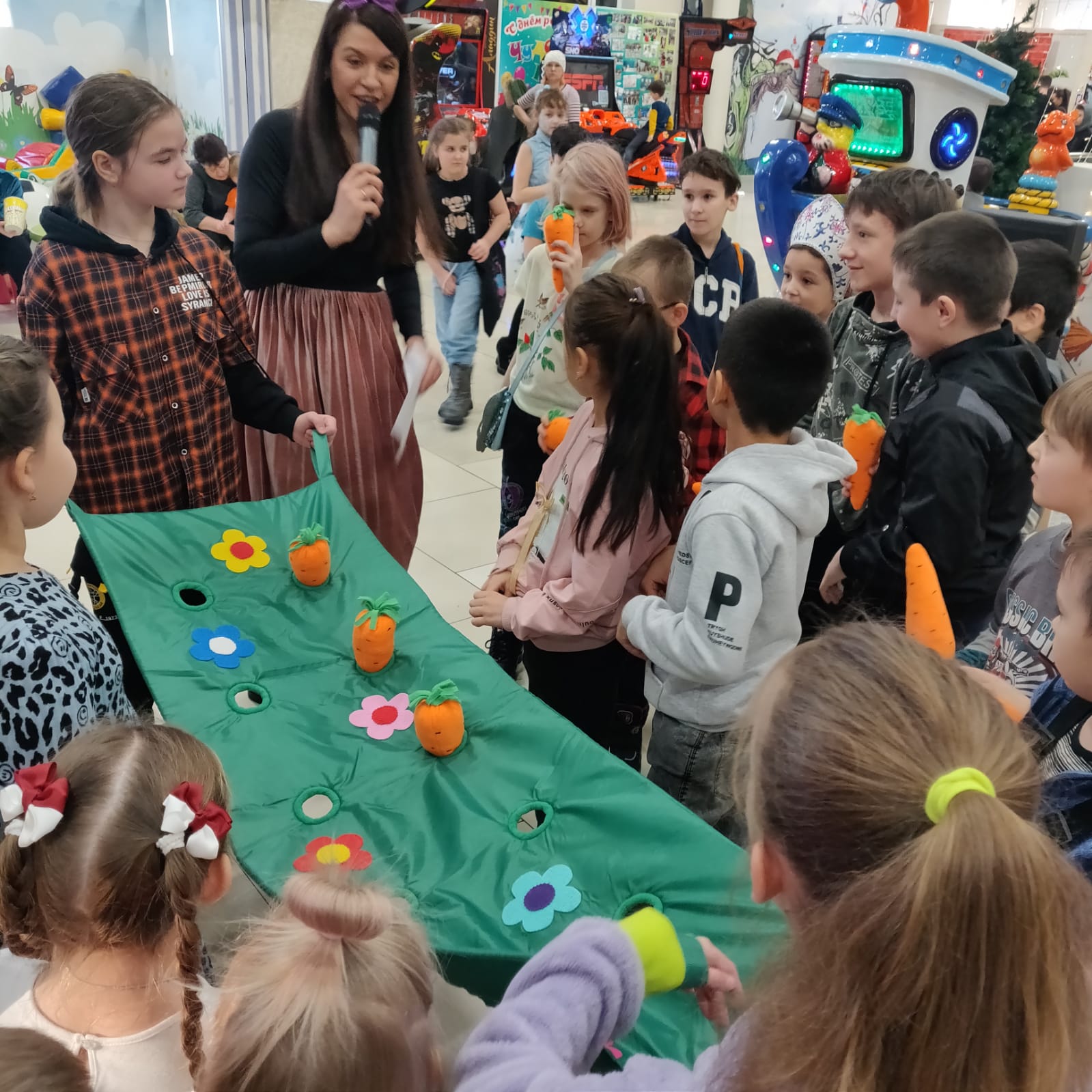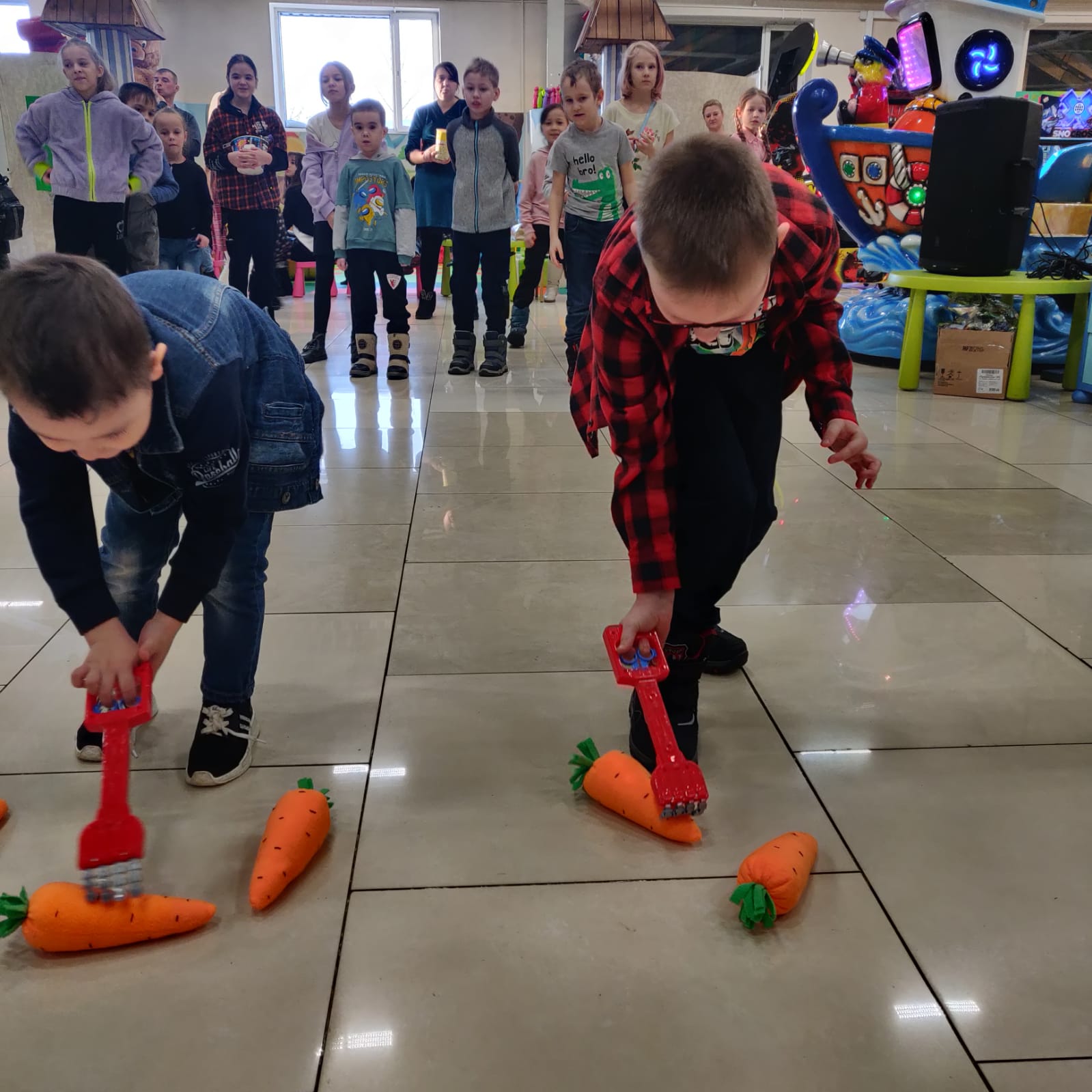 Ну а дальше началась история с угощением крольчат. Конечно же, это была морковка. Участникам предстояло выжать из неё все соки, а чтобы всем хватило, побороться. Как оказалось, игр на эту тему очень много, и ребятки-крольчатки ловко участвовали в эстафете с обручами, разноцветными кубиками, нейроскакалкой, а в завершение праздника «посадили» грядку моркови с различными пожеланиями: счастья, здоровья, радости, богатства, достатка, надежды, успехов, удачи, добра, ярких впечатлений и море позитива.
