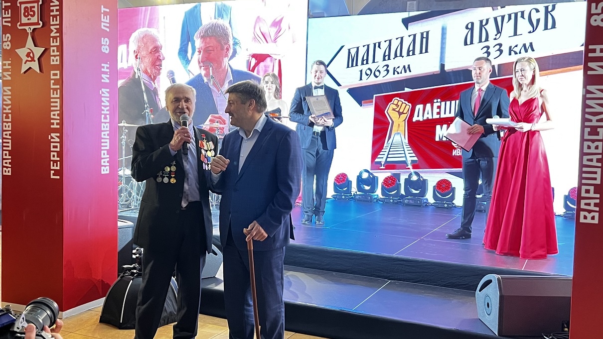 Поздравляя юбиляра от коллектива Акционерной компании «Железные дороги Якутии», Василий Владимирович подчеркнул, что Иван Николаевич не уехал, не бросил, то, что построил и до сих пор живет в Тынде. Многие бамовцы и жители Тынды чтят и ценят это. Он отметил, что Иван Николаевич, как очень мудрый человек, всегда смотрит в будущее, и четыре года назад на одном большом совещании он в присутствии руководства Российских железных дорог, руководителей министерств и ведомств сказал: «А когда начнется дорога на Магадан?». «Иван Николаевич, дорогой мой, наша задача в год 50-летия строительства БАМа уложить серебряное звено на станции Нижний Бестях и начать строительство дороги на Магадан» - с этими словами и пожеланиями дожить до укладки «золотого звена» железной дороги Нижний Бестях – Магадан» генеральный директор АО «АК «ЖДЯ» вручил Ивану Николаевичу символический «золотой» костыль, на котором выгравированы слова, ставшие девизом: «Даешь Магадан!» и «Новая «Балбухта».