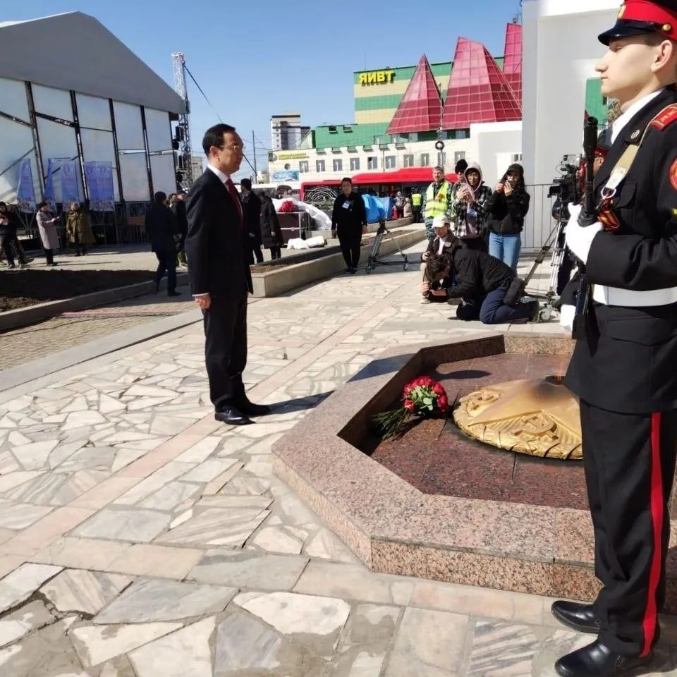 К монументу павшим воинам-якутянам первыми возложили цветы глава Якутии Айсен Николаев, ветераны Великой Отечественной войны Кирилл Павлов, Наум Слепцов, Петр Яковлев, герой Российской Федерации, командир якутского добровольческого отряда «Боотур-1» Александр Колесов.