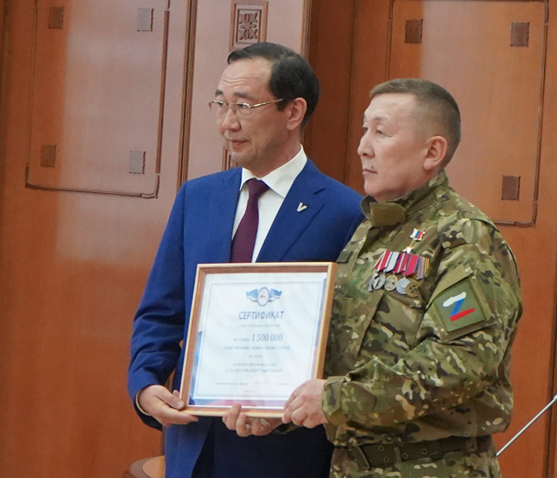 Глава Якутии Айсен Сергеевич Николаев в своем выступлении выразил Александру Колесову уважение от имени всех жителей Якутии, отметил мужество и воинскую доблесть Героя.
