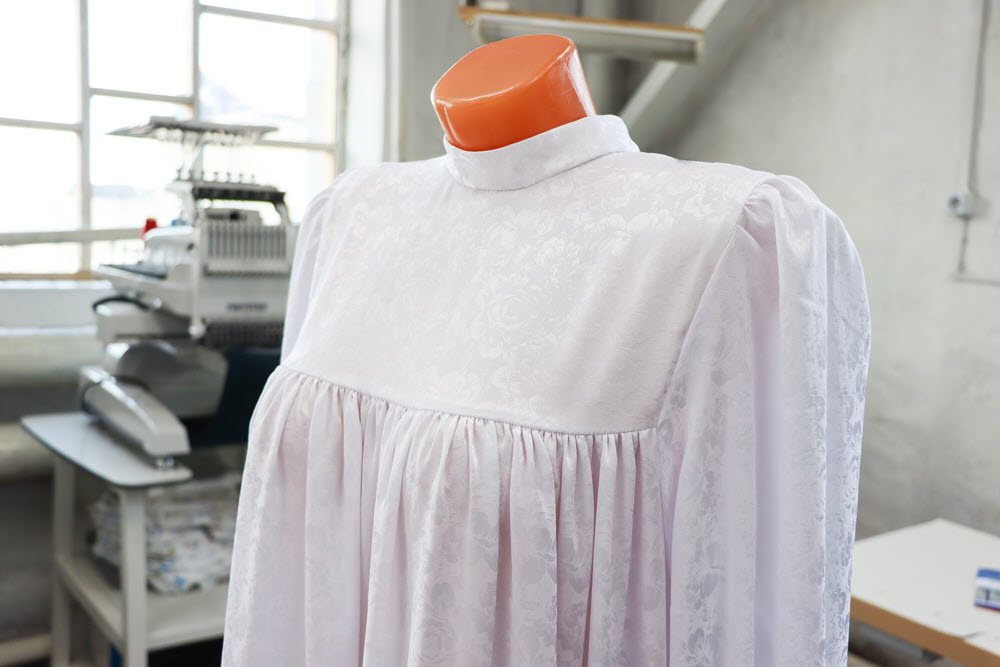 Осужденные сшили халадаи объемной формы, с кокеткой по полочке и спинке из белоснежной шелковой ткани. По низу платья и объемных рукавов притачали оборки.