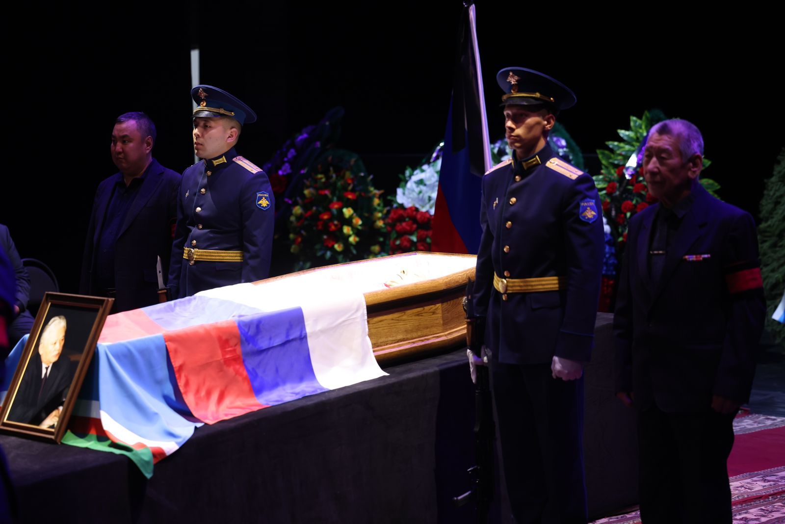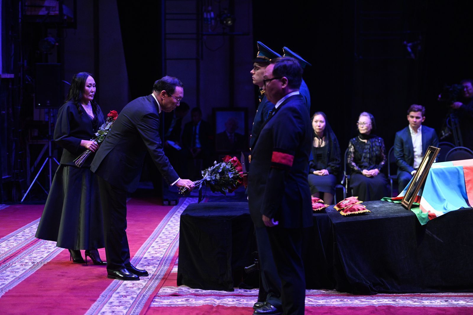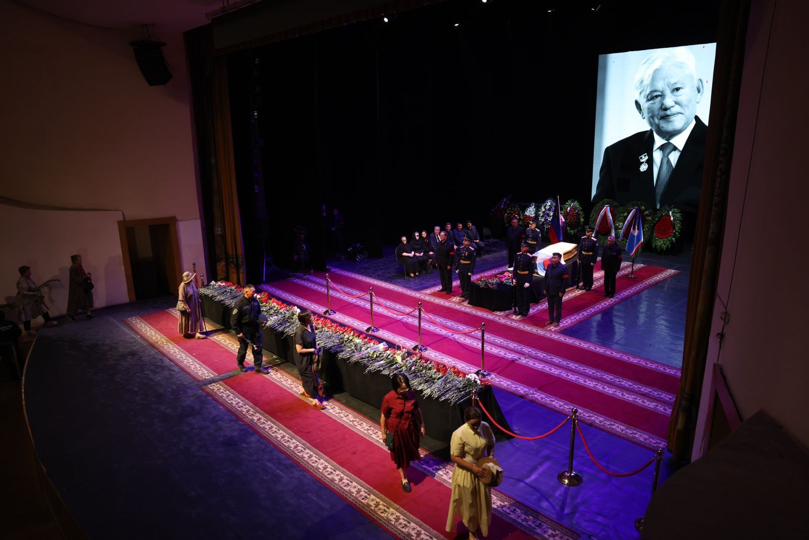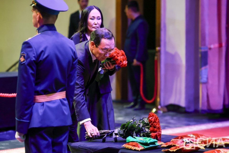 В Якутске в театре оперы и балета идет церемония прощания с первым президентом Якутии Михаилом Николаевым. Проститься пришли глава Якутии Айсен Николаев, старейшины, соратники, члены Совета Федерации, народные депутаты, члены правительства, общественные деятели и многие другие.