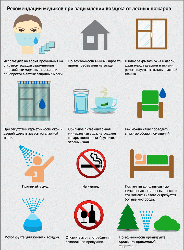 - дома по возможности держите окна плотно закрытыми, хотя бы ночью и рано утром, когда задымление достигает своего максимума;