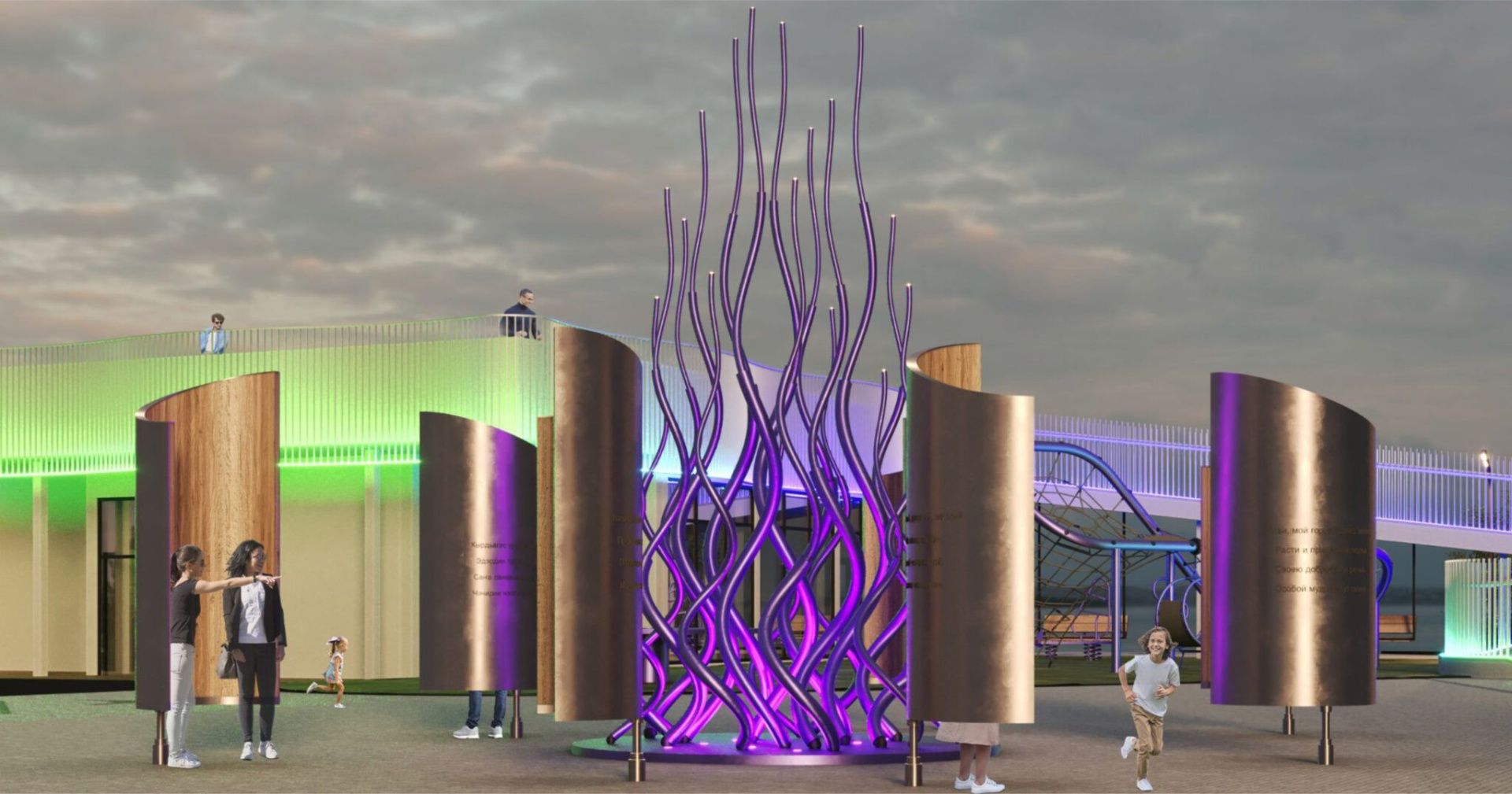 На площади появится интерпретация вечного огня — инсталляция «Всполохи», которая защитит от ветра с реки. Скамейки с высокой спинкой можно поворачивать по своей оси в зависимости от направления ветра. Эта конструкция также поможет защититься от солнца. На спинках скамеек выгравированы стихи колымчан, участвовавших в конкурсе в рамках подготовки заявки. В центре композиции находится арт-объект, напоминающий пламя. Это современная интерпретация вечного огня. Композиция подсвечивается цветным светом, который отражается от металлических спинок: эффект будет напоминать северное сияние. Линии и образы северного сияния можно увидеть в форме качелей для взрослых и детей, а также игрового оборудования на детской площадке.