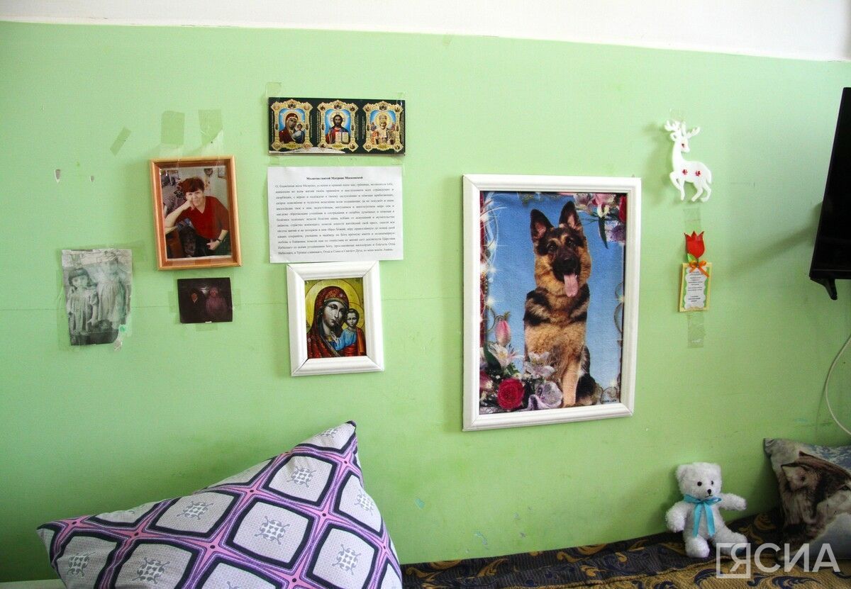 В доме-интернате в комнате живут по два-три человека. Каждый обустроил свой уголок так, как ему нравится, — здесь и любимые книги, награды, фотографии, рисунки. Например, у старожила Капитоновского дома Татьяны Бахаревой висит большой плакат с собакой.