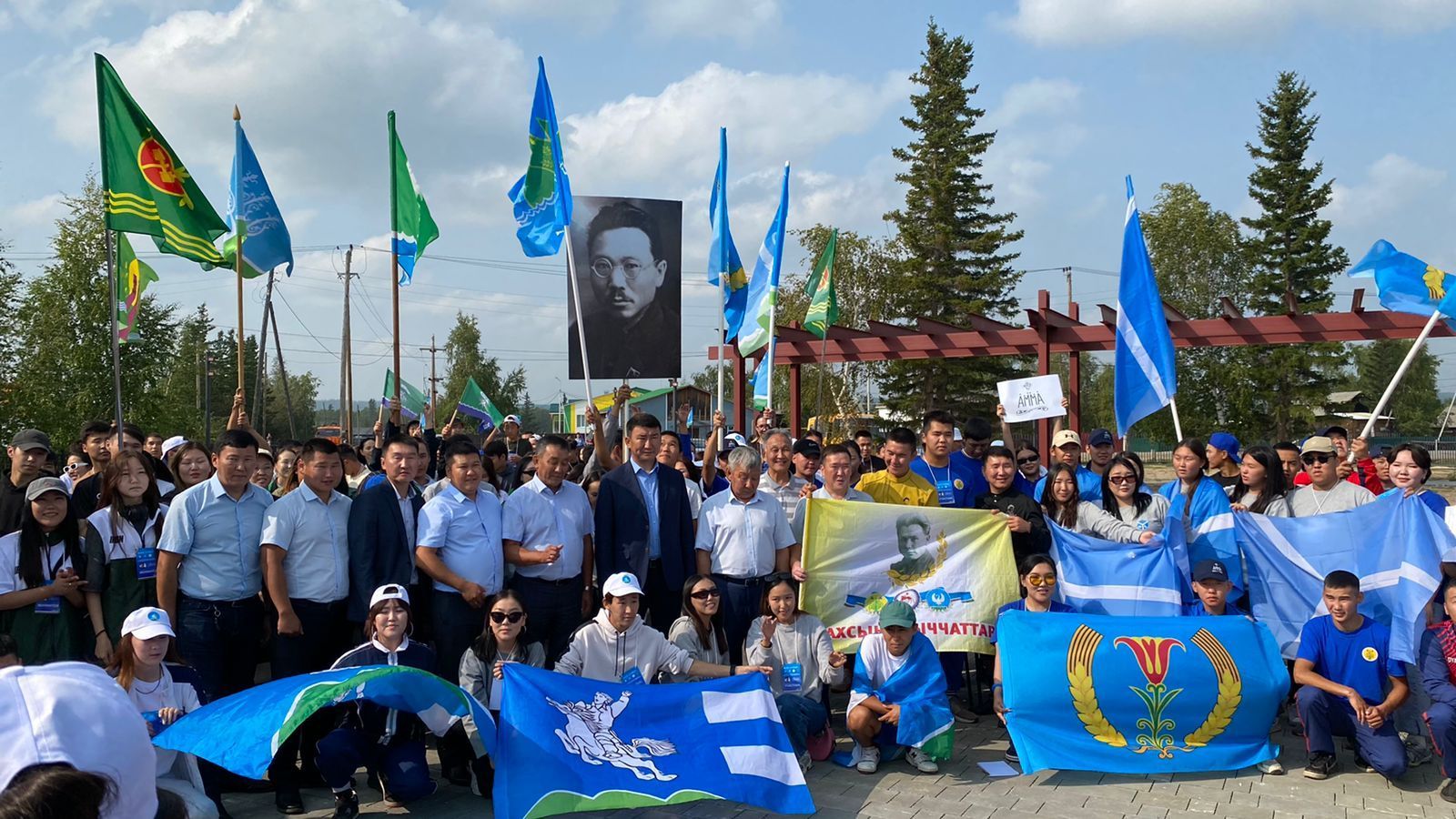 Торжественное открытие слета началось в сквере Республики с. Столбы с возложения цветов к памятнику выдающемуся государственному и политическому деятелю Максиму Кировичу Аммосову.