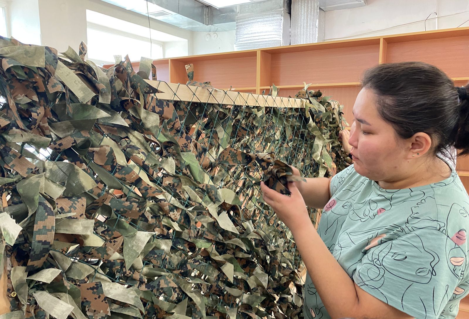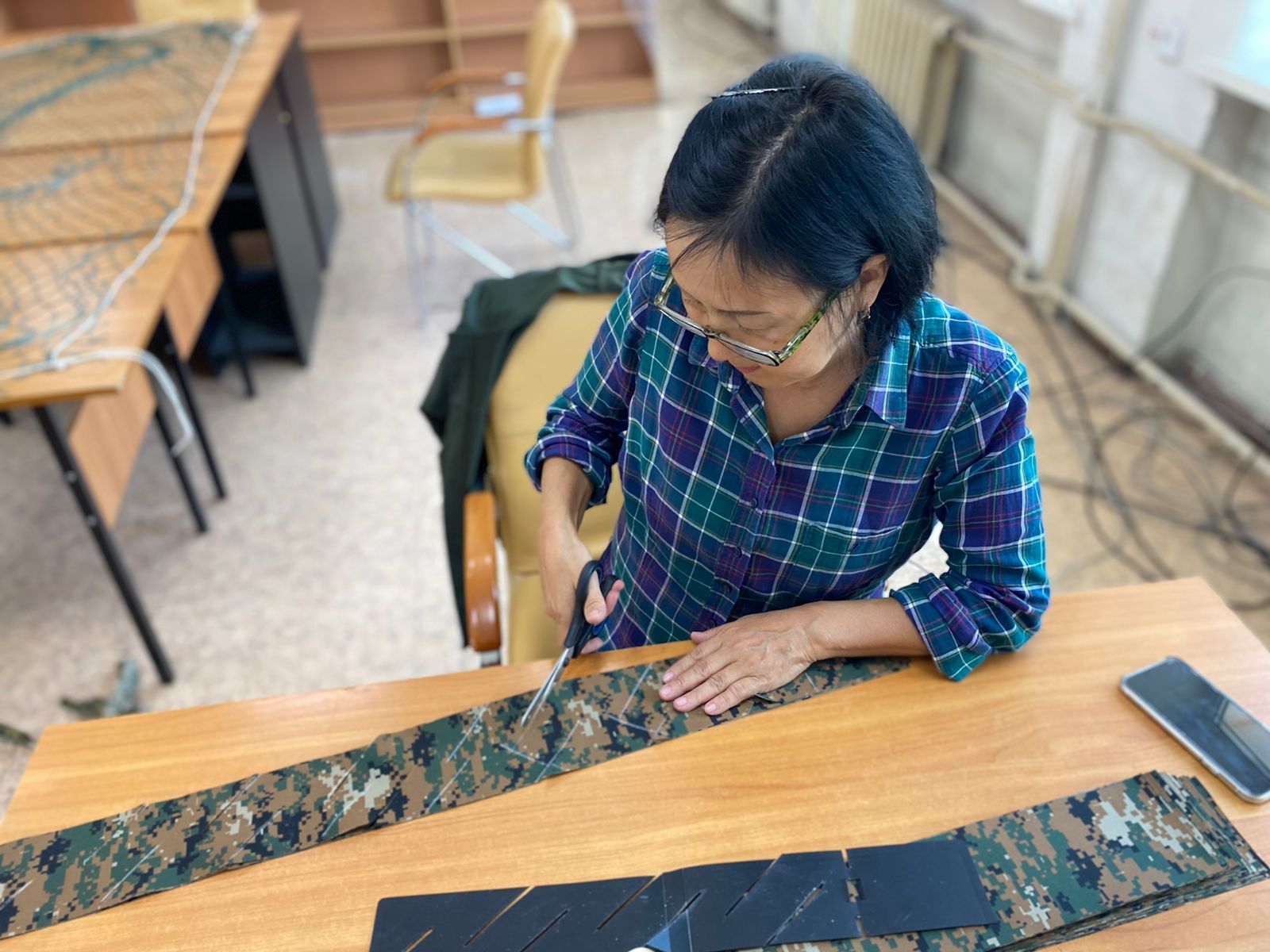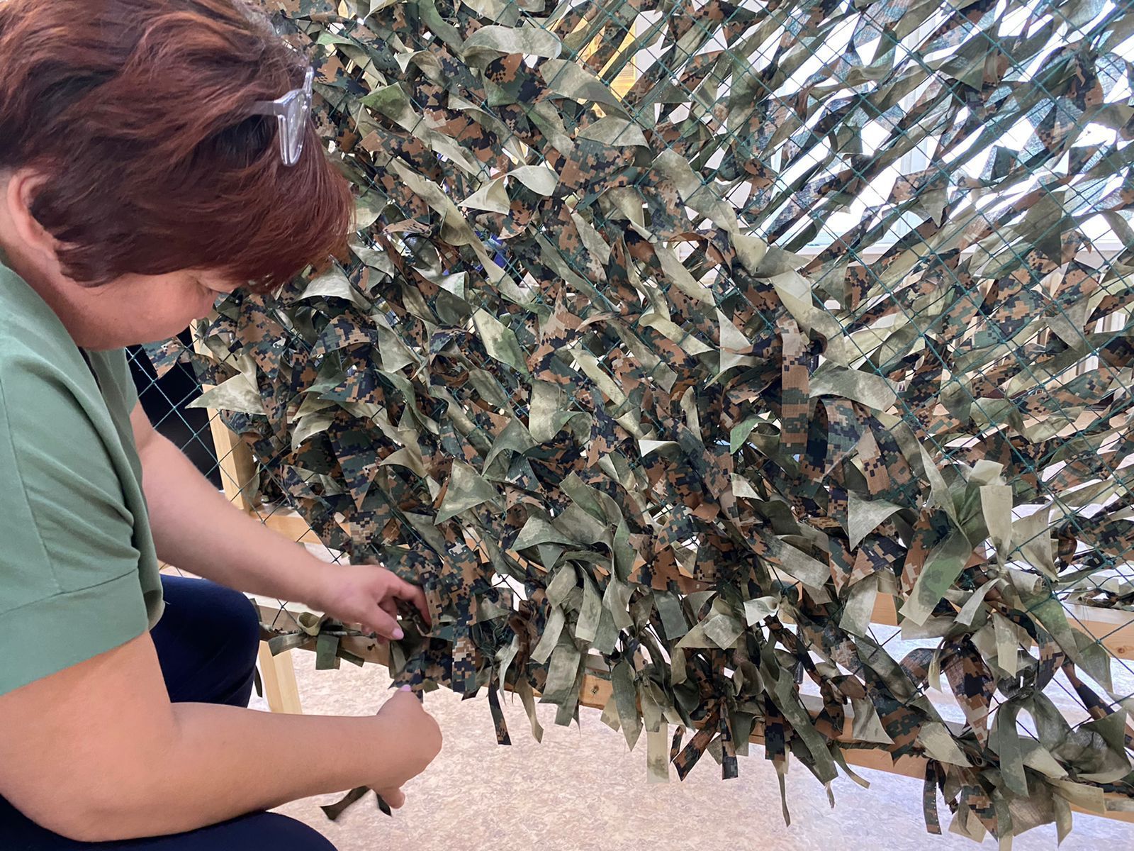 Волонтеры плетут для участников специальной военной операции маскировочные сети. В первый день работы филиала, 21 августа, «Боевые шелкопряды» провели мастер-класс: показали, как работать с материалом, лекалом, как натягивать сети на станок.