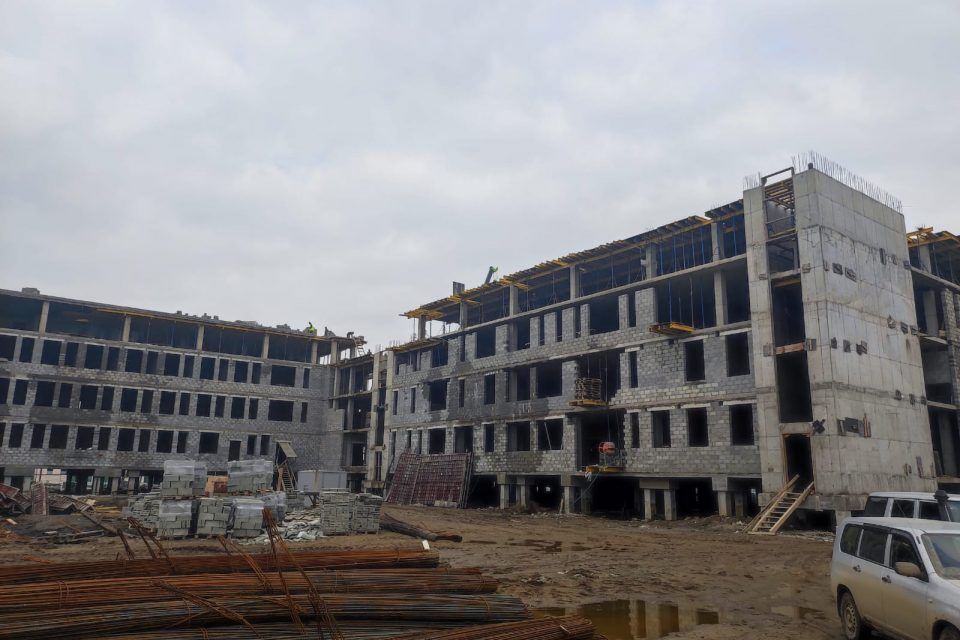Силами 50 строителей в здании ведутся устройство покрытия, перекрытия, кладочные работы на втором, третьем этажах, штукатурка стен, прокладка кабелей и проводов электроснабжения, утепление пола на первом этаже, монтаж резервуаров в насосной станции, вынос сетей теплоснабжения.