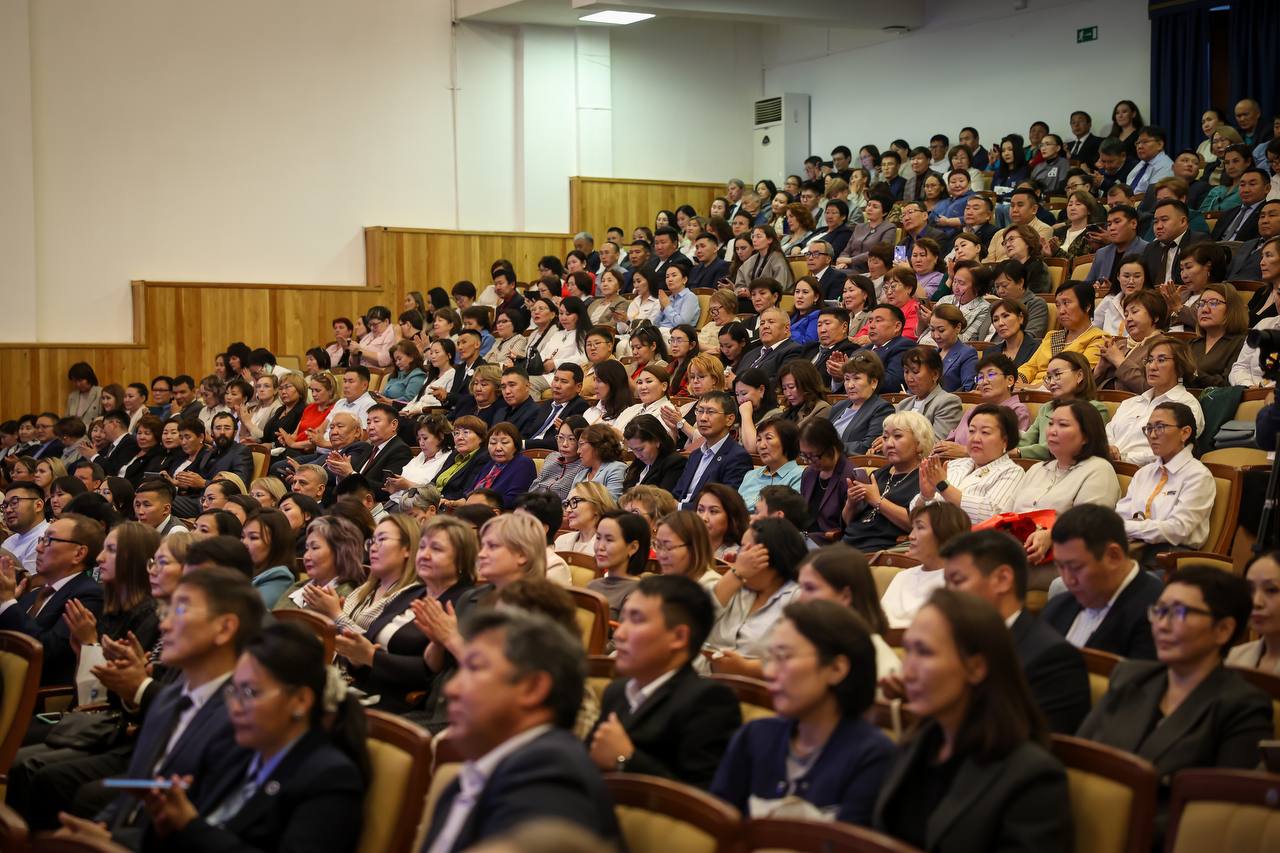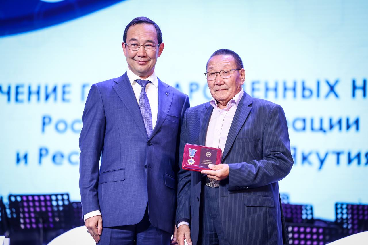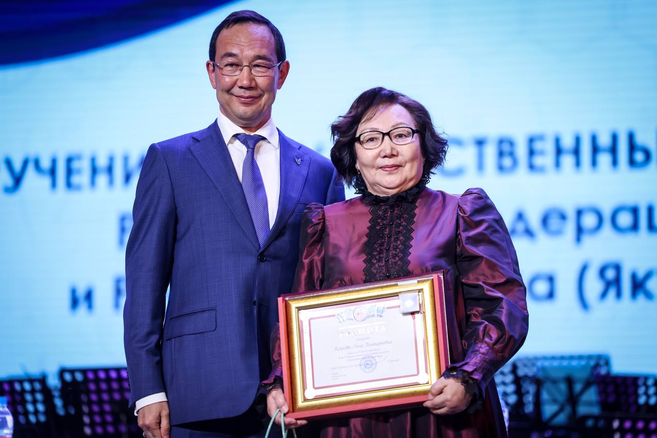 Глава вручил государственные награды Российской Федерации и Республики Саха (Якутия). Почетное звание «Заслуженный учитель Российской Федерации» присвоено учителям: национальной политехнической средней школы №2 г. Якутска Маргарите Денисовой и Сатагайской средней школы Амгинского улуса Ольге Терентьевой.