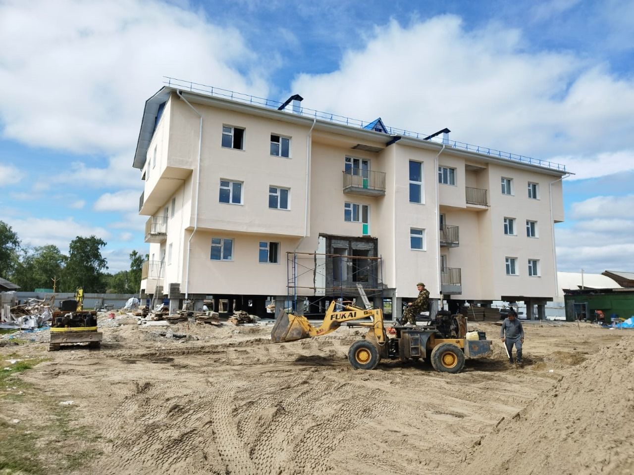В трехэтажном доме разместятся 23 благоустроенные квартиры, их получат переселенцы. На сегодня строительная готовность объекта составляет 90%. Ведутся работы по благоустройству территории: проезды и площадки, детская площадка, тротуары, озеленение и освещение.