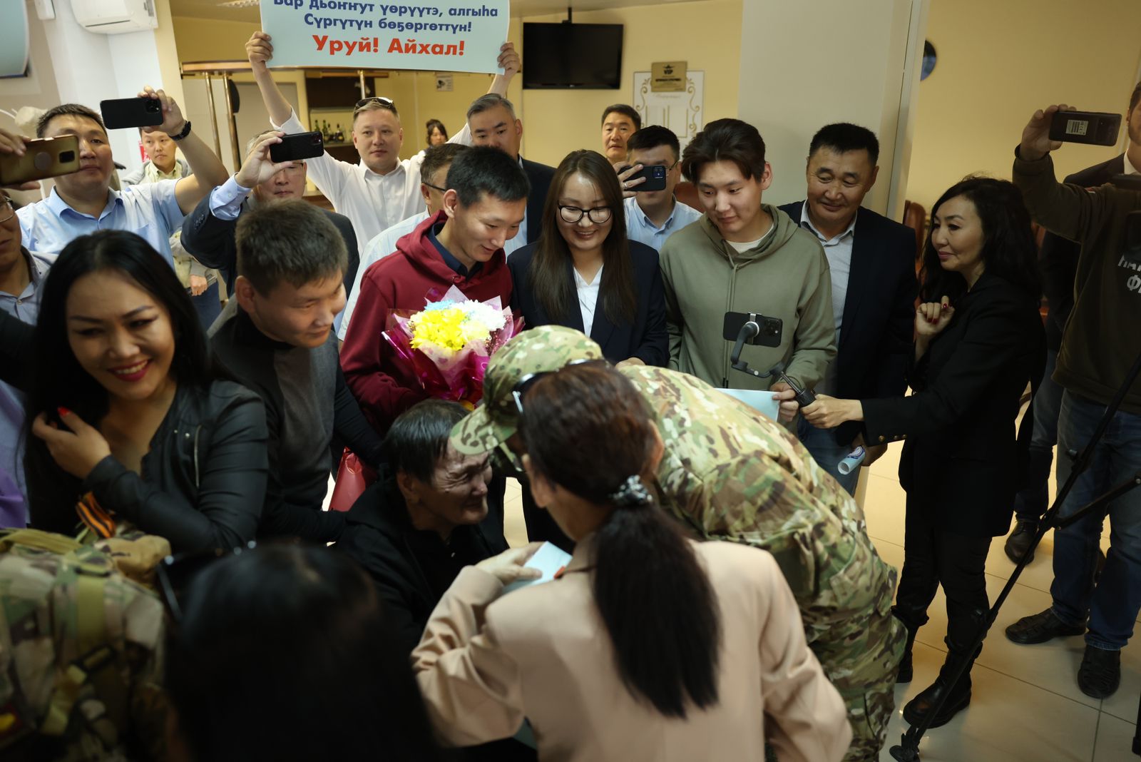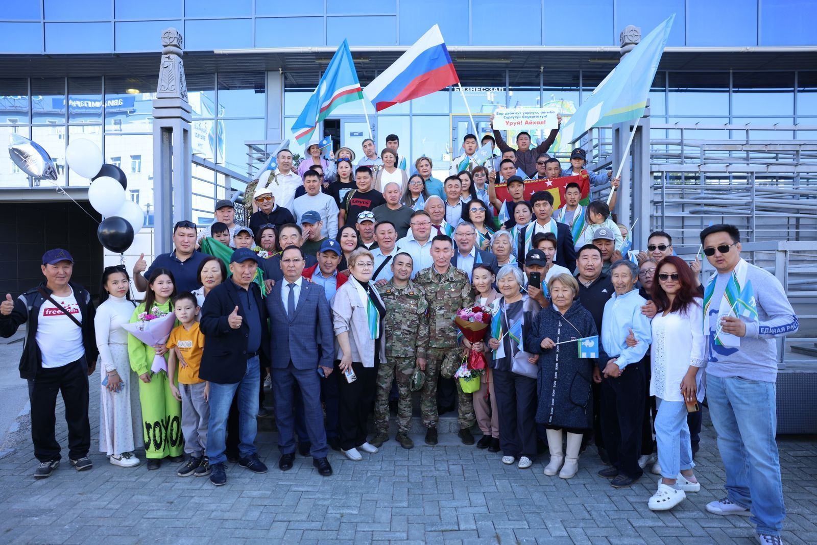 Во вторник утром в аэропорту Якутска торжественно встретили Героев России Алексея Неустроева и Филиппа Евсеева. Поприветствовать военнослужащих приехали глава республики Айсен Николаев, Герой России Александр Колесов, родные, близкие, земляки и друзья.